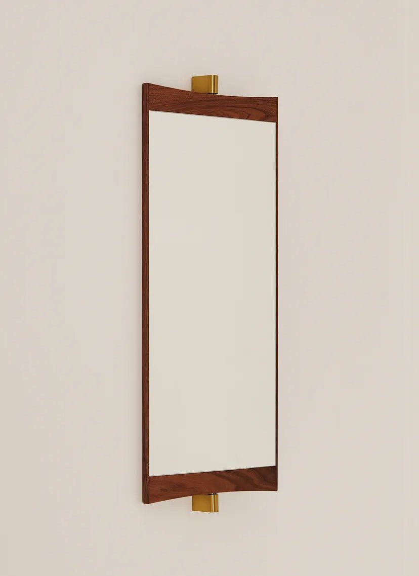 A contemporary echo of the 18th-century vanity-table mirror that gives it its name, the Vanity Mirror Collection is GamFratesi’s second wall-mounted mirror design for GUBI. The collection comprises three variations – with one, two and three mirror panels, respectively. The design’s defining features are its warm walnut veneer and brass hinges. These allow the angle of the mirror to be adjusted, influencing the perspective it offers and the play of the light in the room. On the single-panel Vanity Mirror 1, the hinges permit a 15o rotation, whereas the 180o hinges on the Vanity Mirror 2 and Vanity Mirror 3 allow the panels to fold flat on top of one another, covering the mirror when not in use.