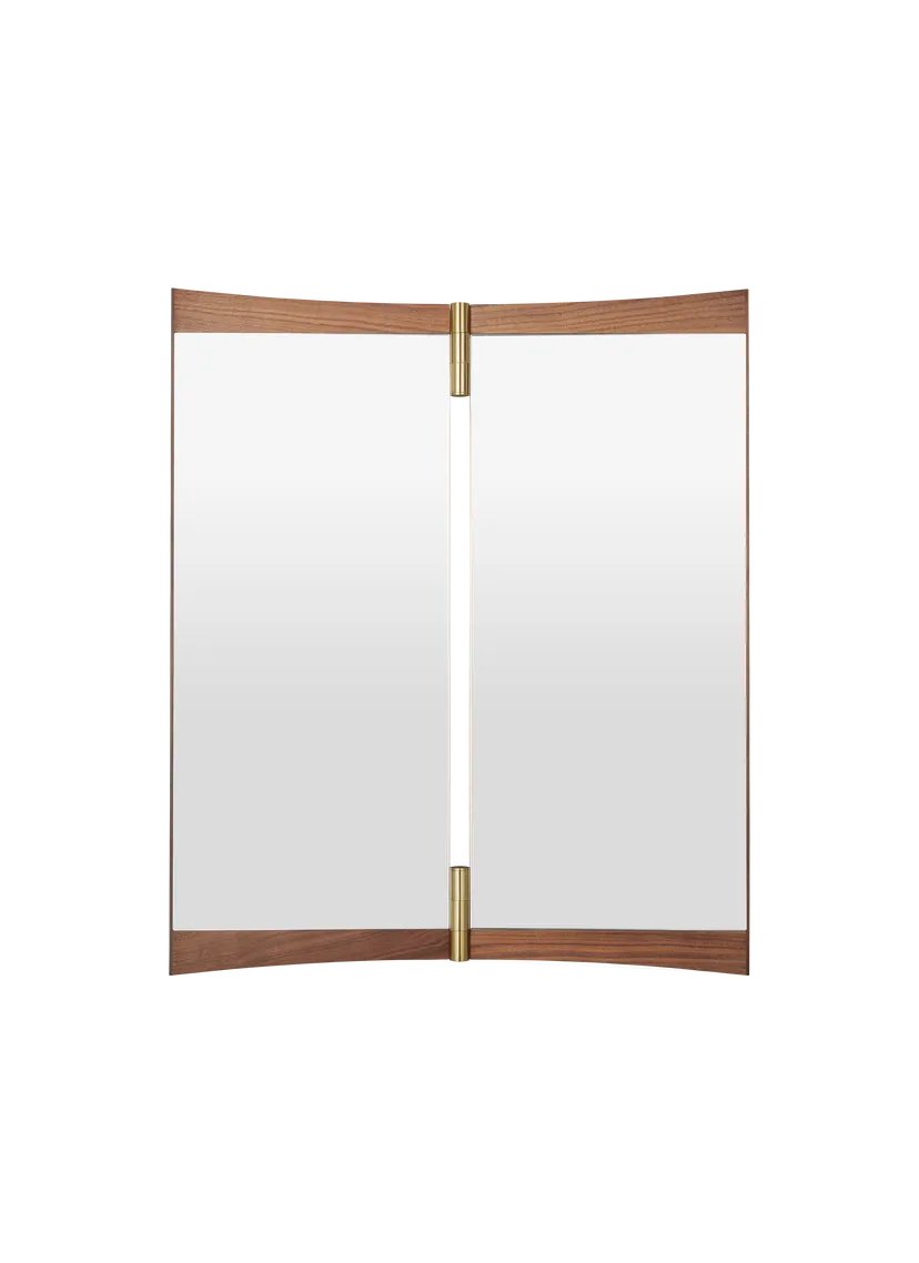 A contemporary echo of the 18th-century vanity-table mirror that gives it its name, the Vanity Mirror Collection is GamFratesi’s second wall-mounted mirror design for GUBI. The collection comprises three variations – with one, two and three mirror panels, respectively. The design’s defining features are its warm walnut veneer and brass hinges. These allow the angle of the mirror to be adjusted, influencing the perspective it offers and the play of the light in the room. On the single-panel Vanity Mirror 1, the hinges permit a 15o rotation, whereas the 180o hinges on the Vanity Mirror 2 and Vanity Mirror 3 allow the panels to fold flat on top of one another, covering the mirror when not in use.