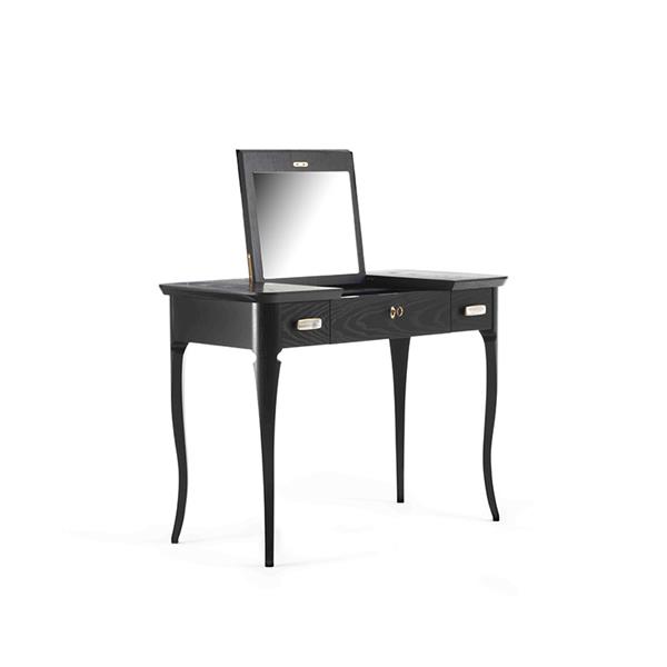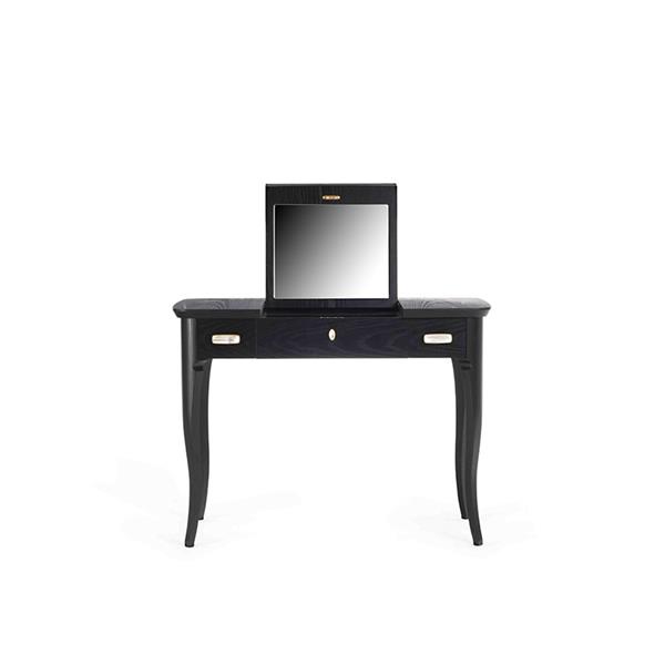 Vanity table with ash wood veneered top with shaped solid wood edge and pull-up mirror. Solid wood and ash wood veneered structure. Drawers runners with Blumotion technology. Brass Decò handles, with buffalo's horn inset.