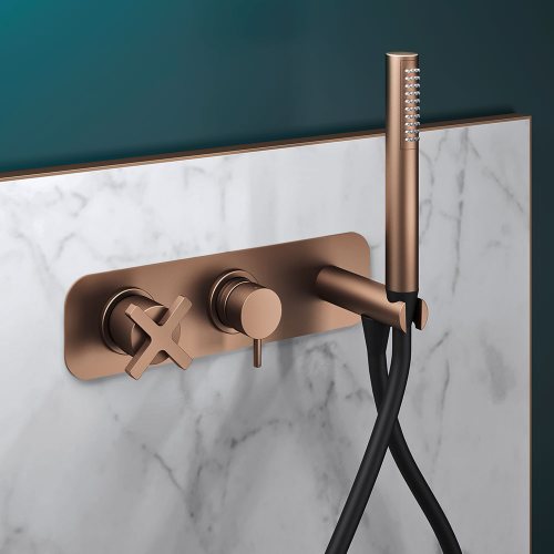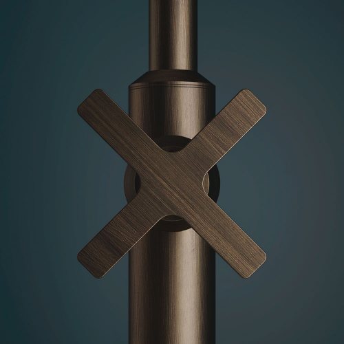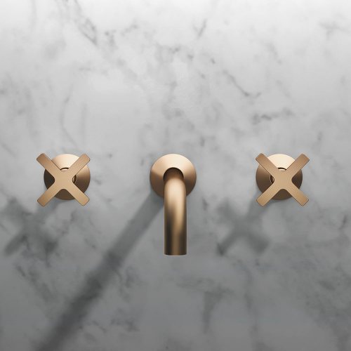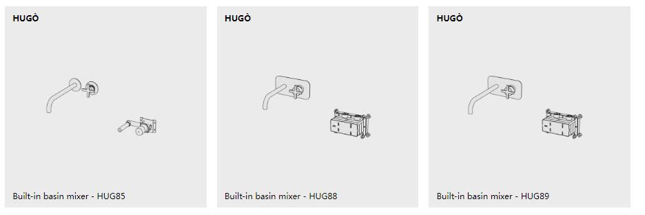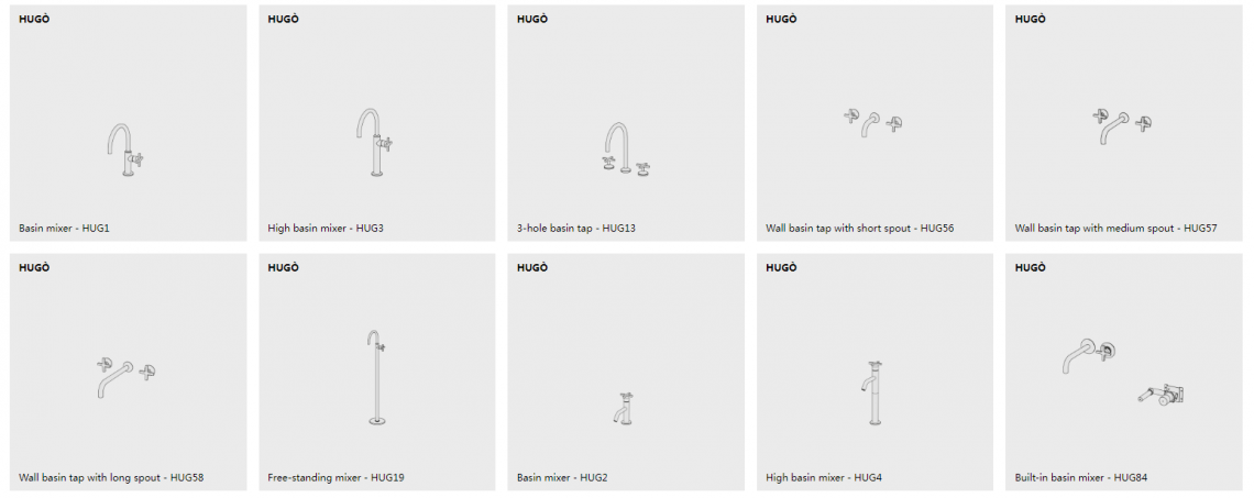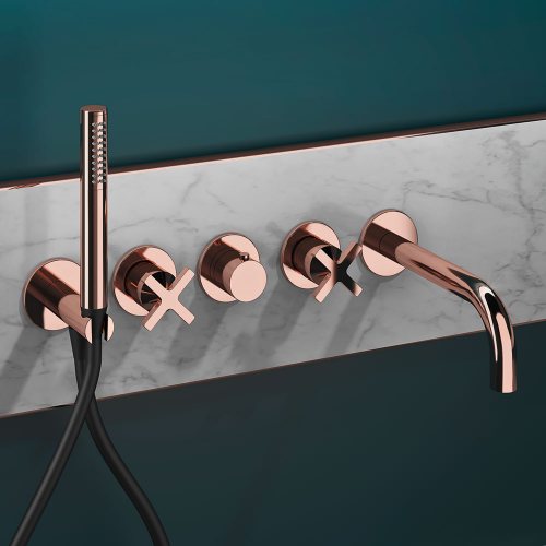 Hugò is a series of brass bathroom mixers. It is available in the mixer version, both single-hole and two-hole, deck-mounted and wall-mounted tap, with two and three holes, and in the exclusive bath and shower kits (also in the high flow rate versions).