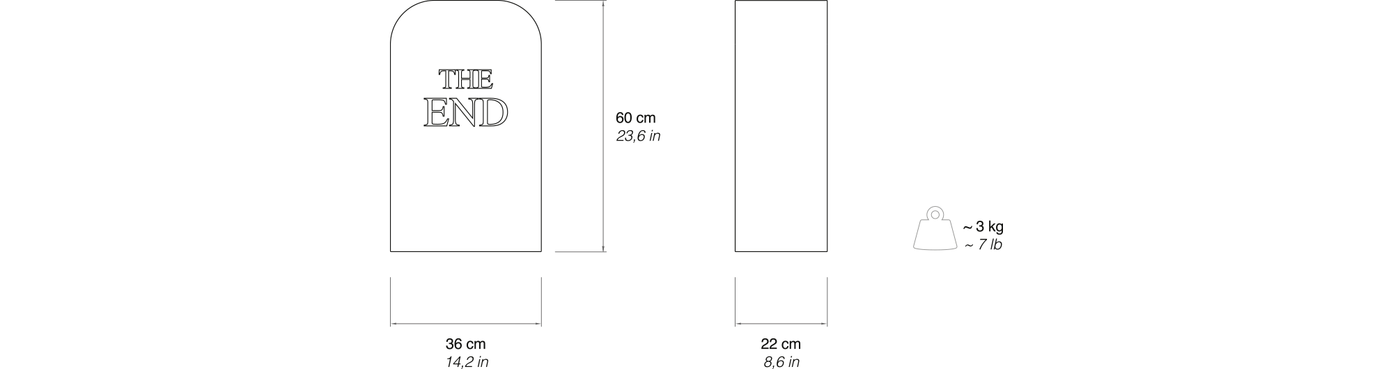 In una paradossale celebrazione del glorioso passato di Gufram,TO|LETPAPER presenta "THE éND", una seduta simile a una lapideche proclama la fine di Gufram in finto marmo. lronia della sorte, ilsuo aspetto funereo è annullato dalla morbidezza e dallaleggerezza della sua composizione in poliuretano. E, nonostantedichiari la fine di Gufram, ci si può sedere su questa lapide come suuno sgabello, incarnando lo spirito di anti-design che Gufram hasempre sostenuto.
