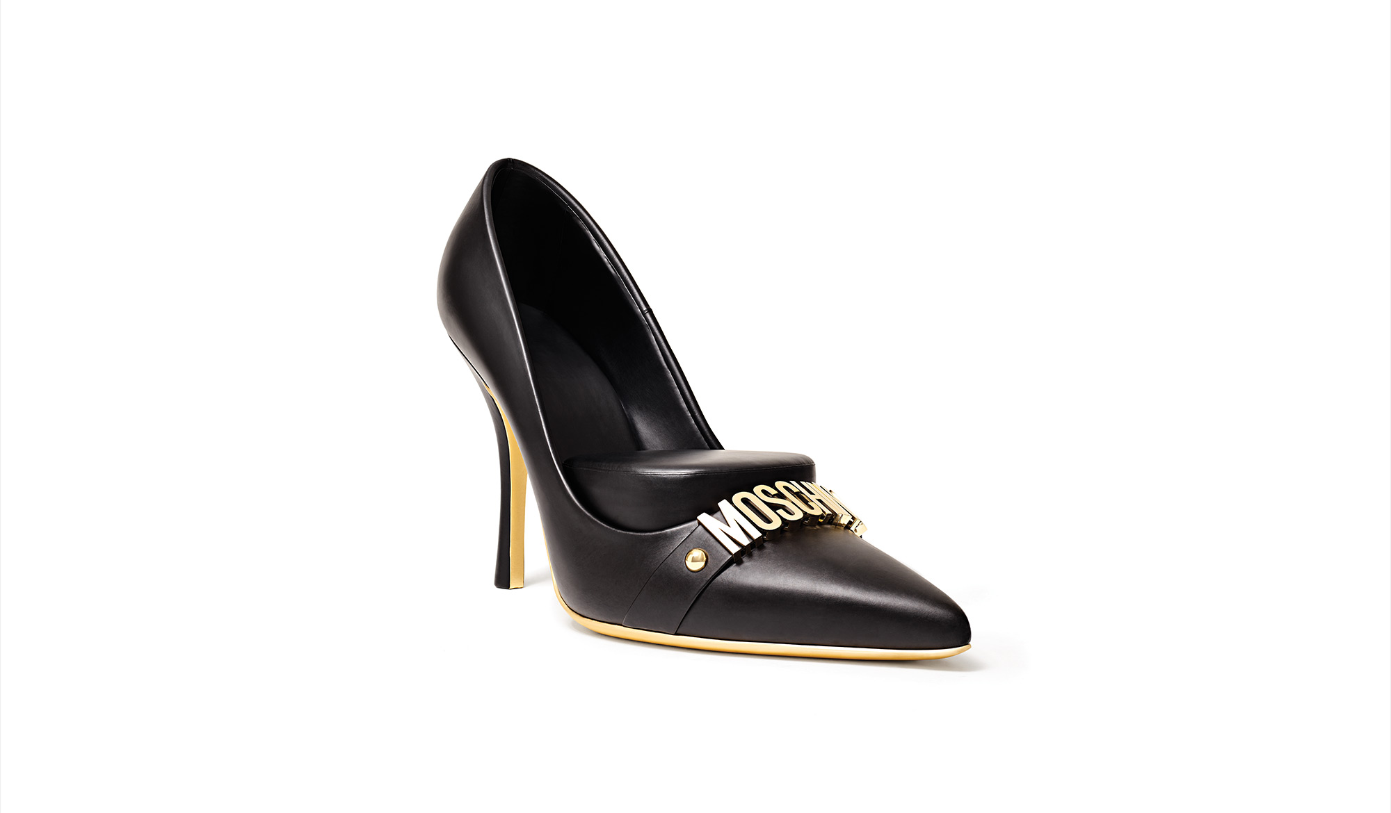 High Heels are two alluring black leather and golden heel pump shoes; inside one is a padded stool; inside the other are three glass shelves: they are unexpected reinterpretations of a seat and of a display cabinet