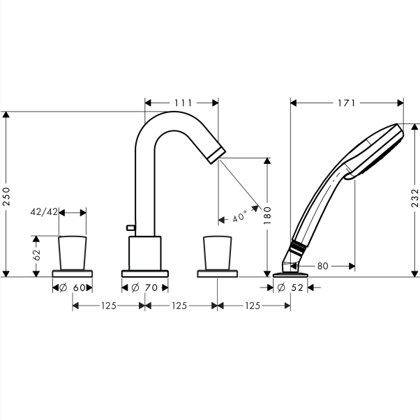 consists of: 3-hole rim mounted single lever bath mixer, hand shower