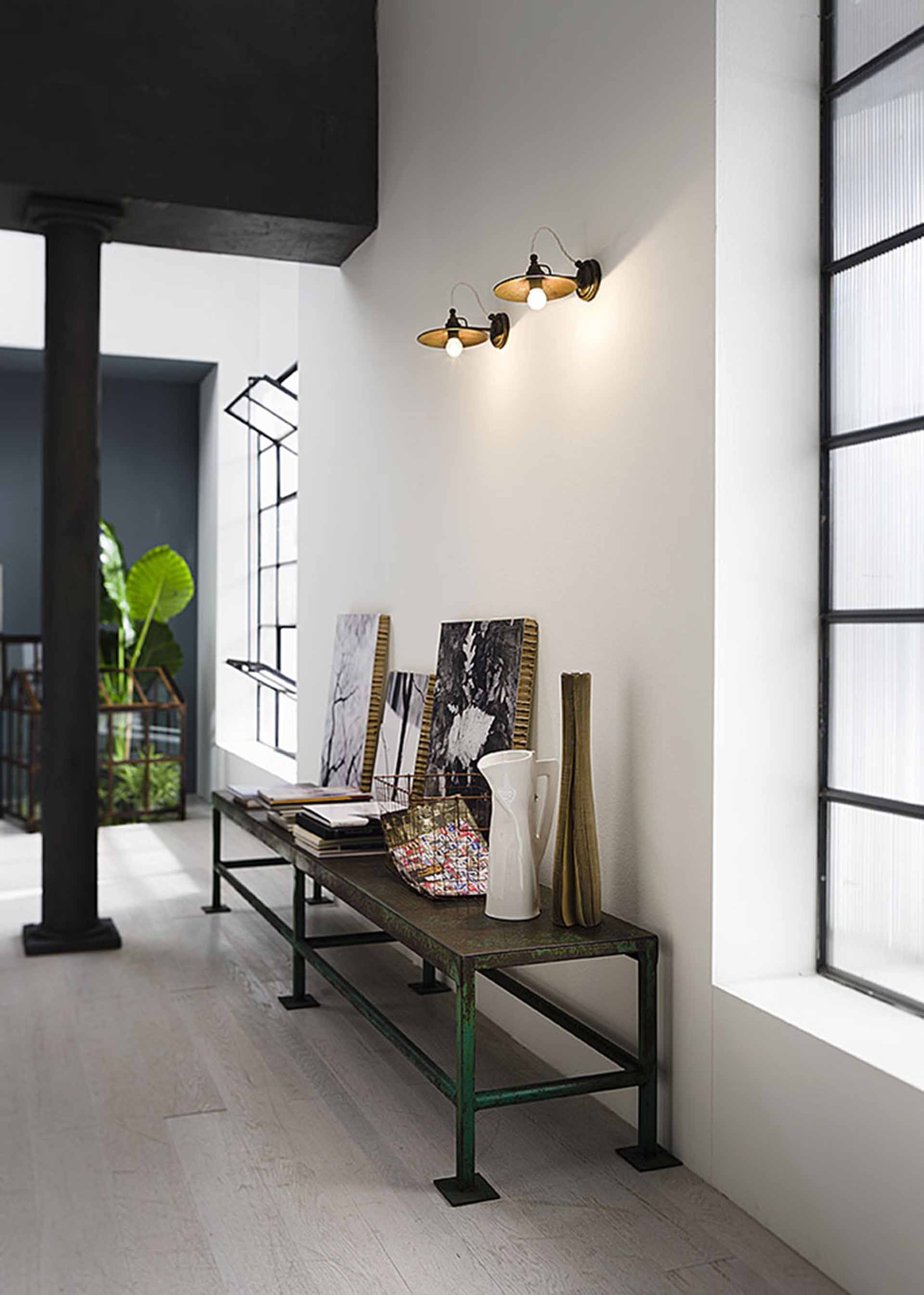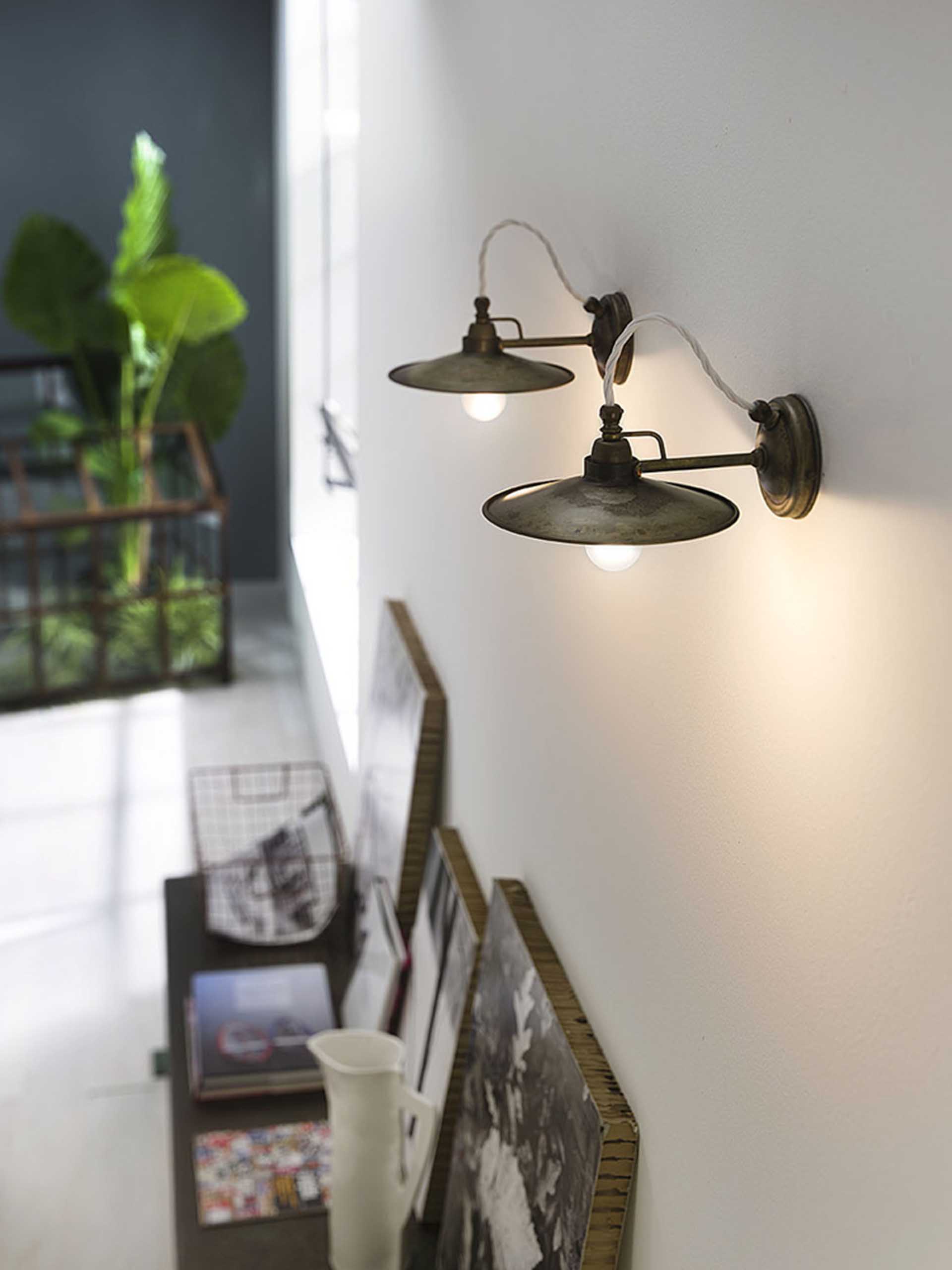 Un voluto richiamo all’arredo tipico di cantine e laboratori artigianali connota le lampade della collezione Cantina. Le forme essenziali sono la nota distintiva di ogni lampada, caratterizzata da un piatto levigato ottone o in ferro anticato. Prodotti moderni e versatili, che ben si inseriscono in differenti contesti. Disponibili in ottone (OO) o ferro (FF).