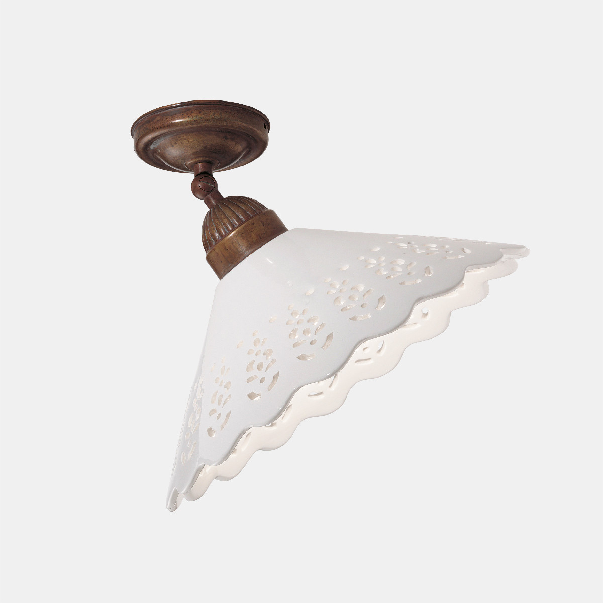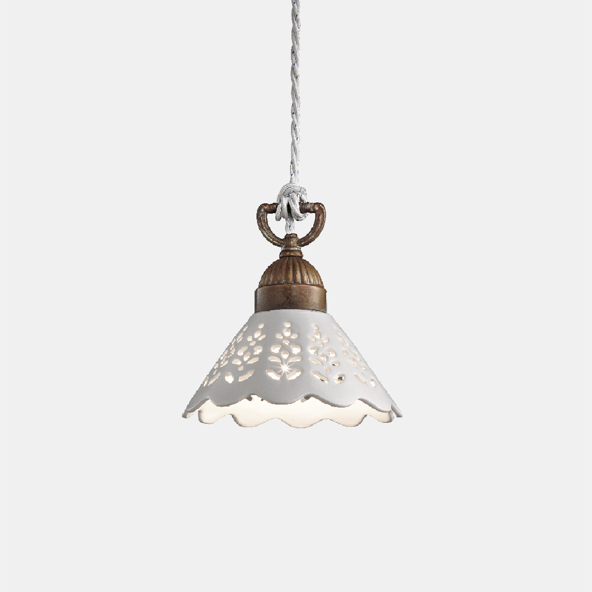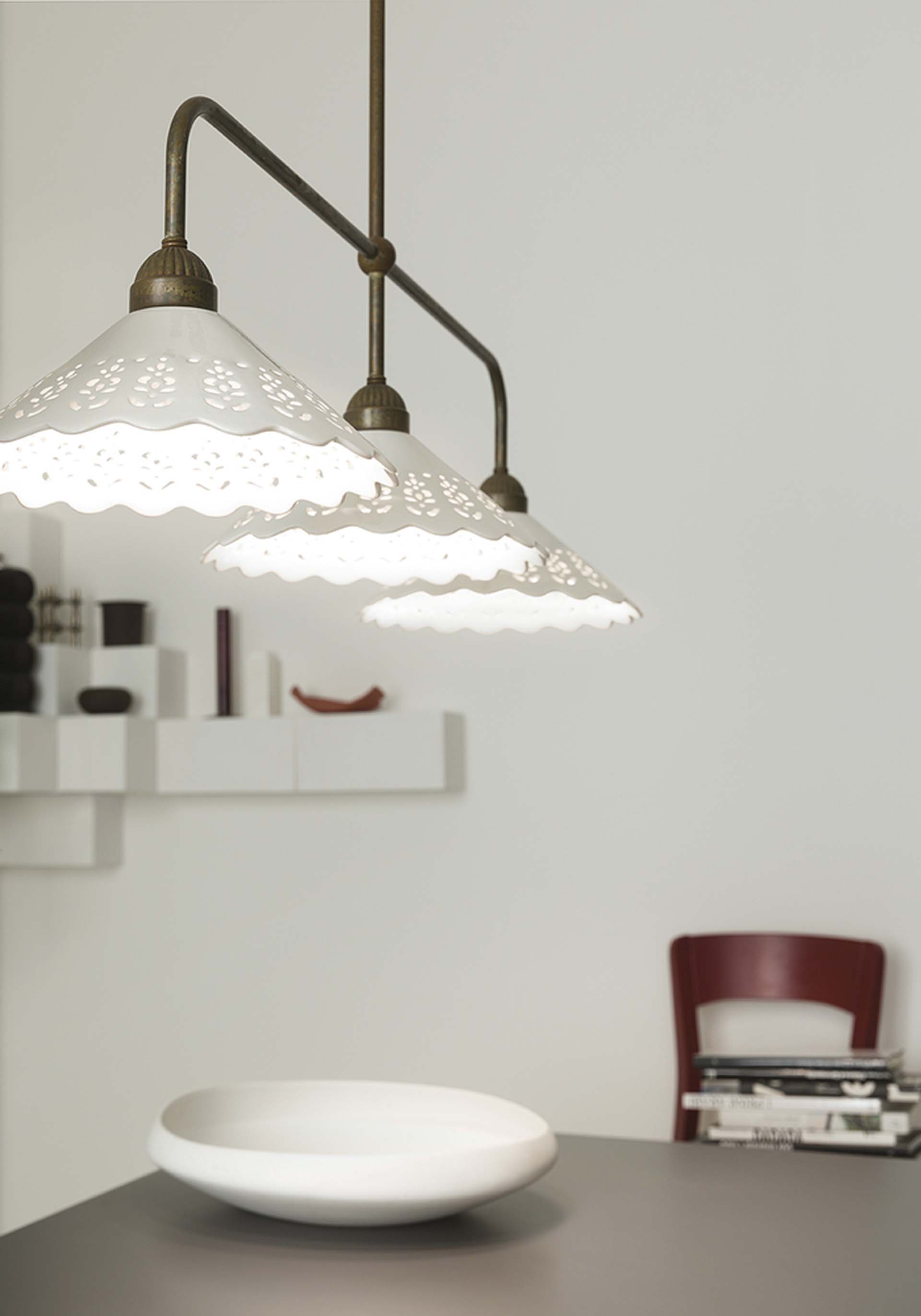 I ricami sapientemente traforati sulle preziose ceramiche di Bassano conferiscono un grande valore estetico alle lampade della collezione Fiori di Pizzo, emblemi di un classicismo rivisitato in chiave moderna. La ricercata lavorazione consente, in fase di illuminazione, la creazione di giochi di luce sulle pareti proiettando fiori e decori.