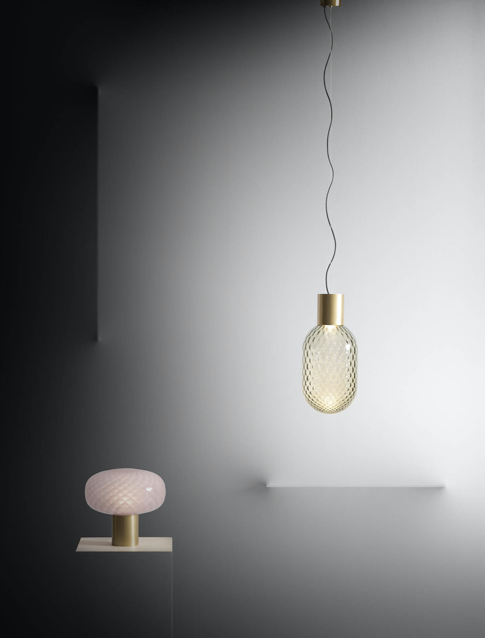 BLOOM ricorda la preziosità delle bottiglie di profumo antiche e la forma dei diffusori orientali di essenze. A seconda del vetro e della fonte luminosa prescelta, l’effetto può essere più ovattato o sensuale. La magia dell’oggetto si sprigiona sia dal pezzo singolo che dalla combinazioni di più varianti. La linea si compone di lampade a sospensione e da tavolo disponibili sia con luce a LED che alogena. Il vetro è grigio (G) o rosa (P) con lavorazione Balloton anche in versione satinata (S).