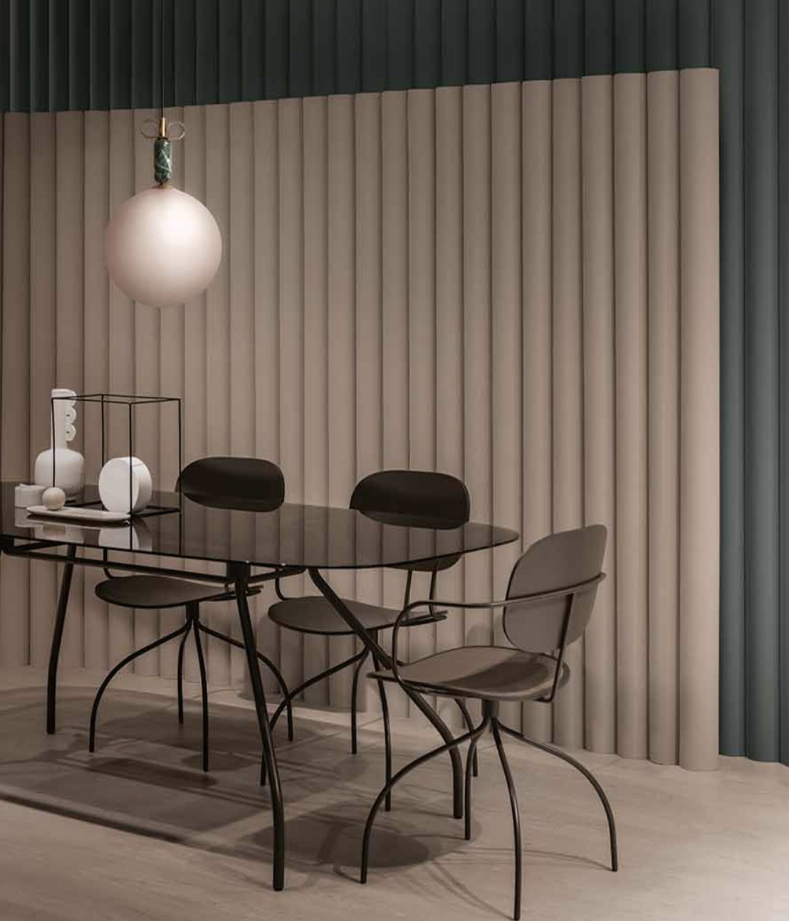 L’allure di Bon Ton si arricchisce di una versione “preziosa” in vetro e marmo, un abito da sera per le occasioni speciali che coniuga animo decò e leggerezza. La sfera di vetro sfumato è disponibile in grigio perla e rosa e l’elemento di marmo in bianco carrara o verde alpi. Il dettaglio del riccio in ottone, elemento emblematico della designer che riporta alla mente l’orecchino simbolo di eleganza e femminilità, è stato mantenuto nella sua versione originale. Un’opera di luce in cui elementi tipici dell’Italian style vengono reinterpretati con grazia in maniera contemporanea e iconica.