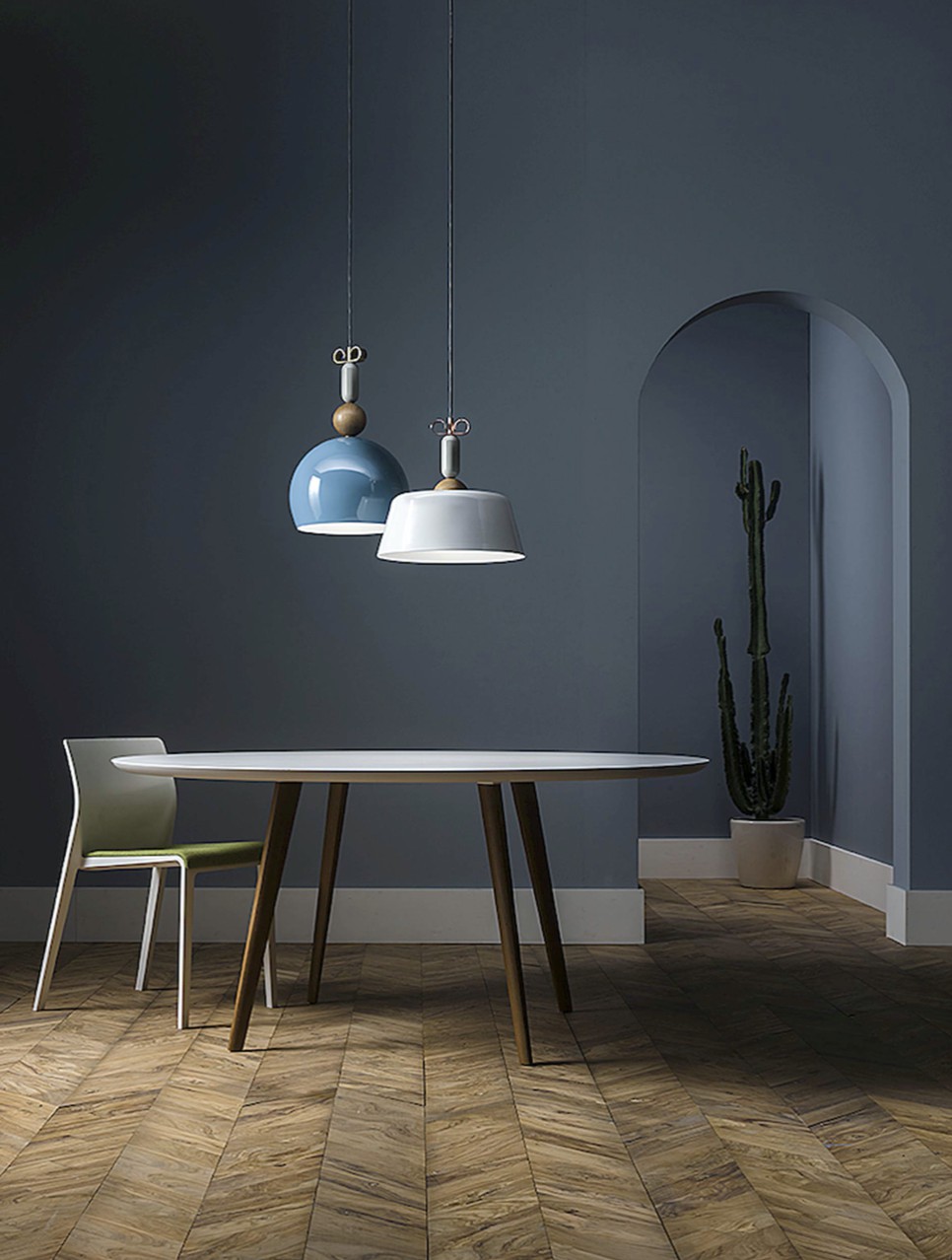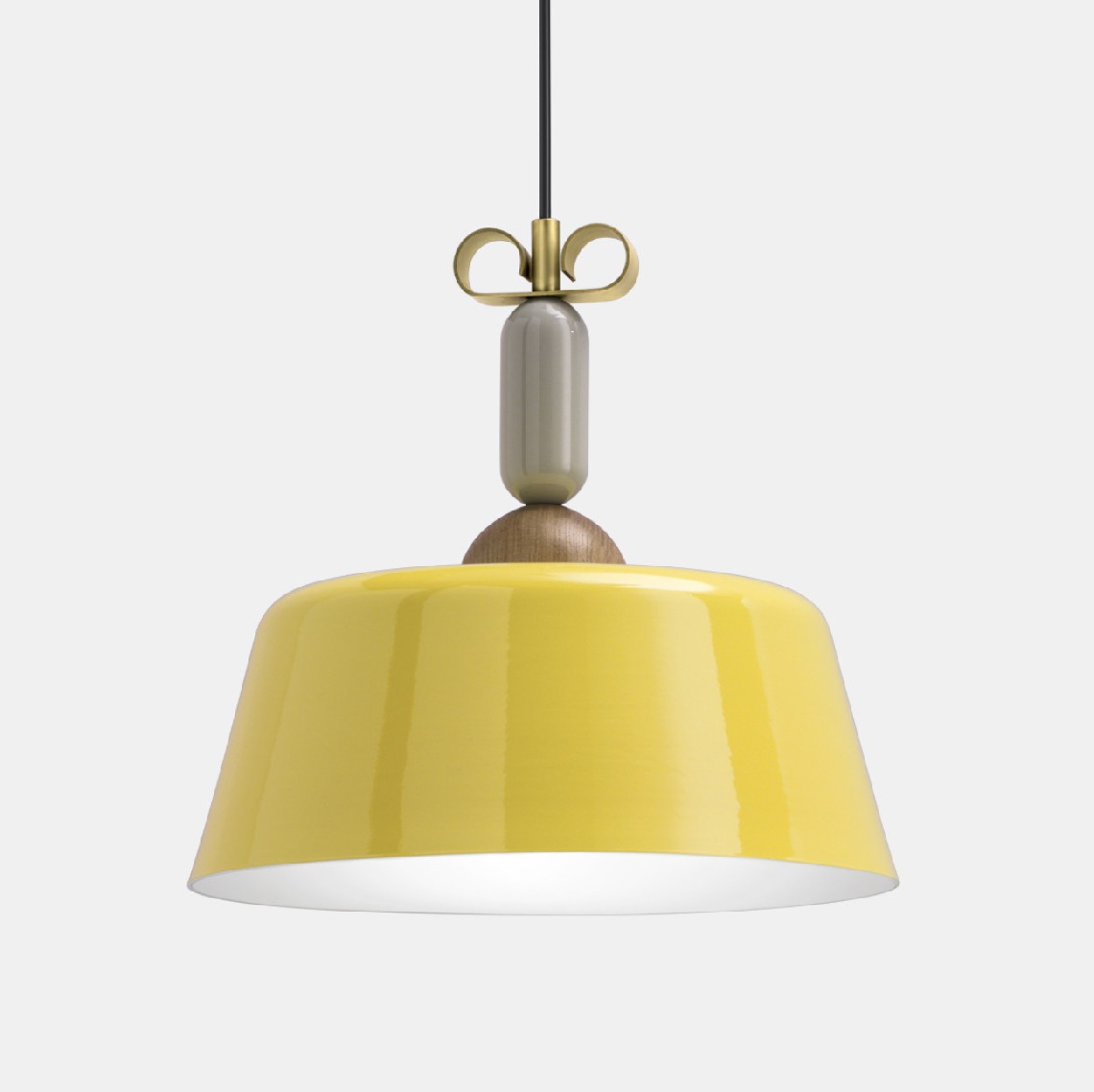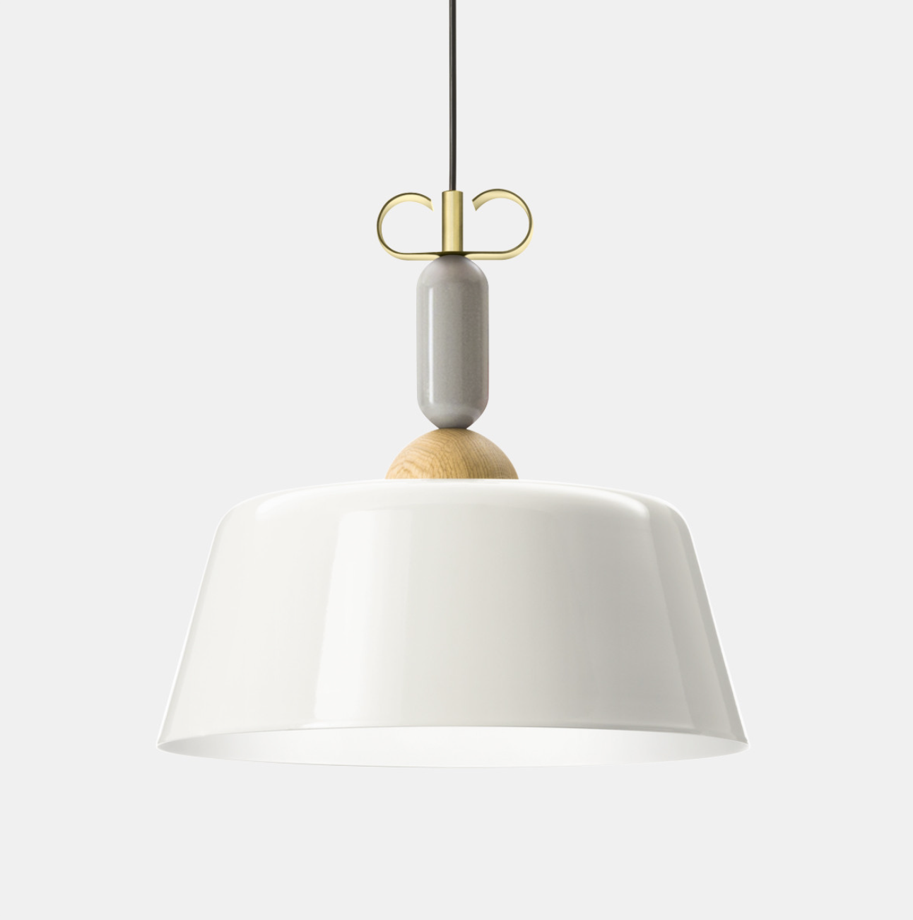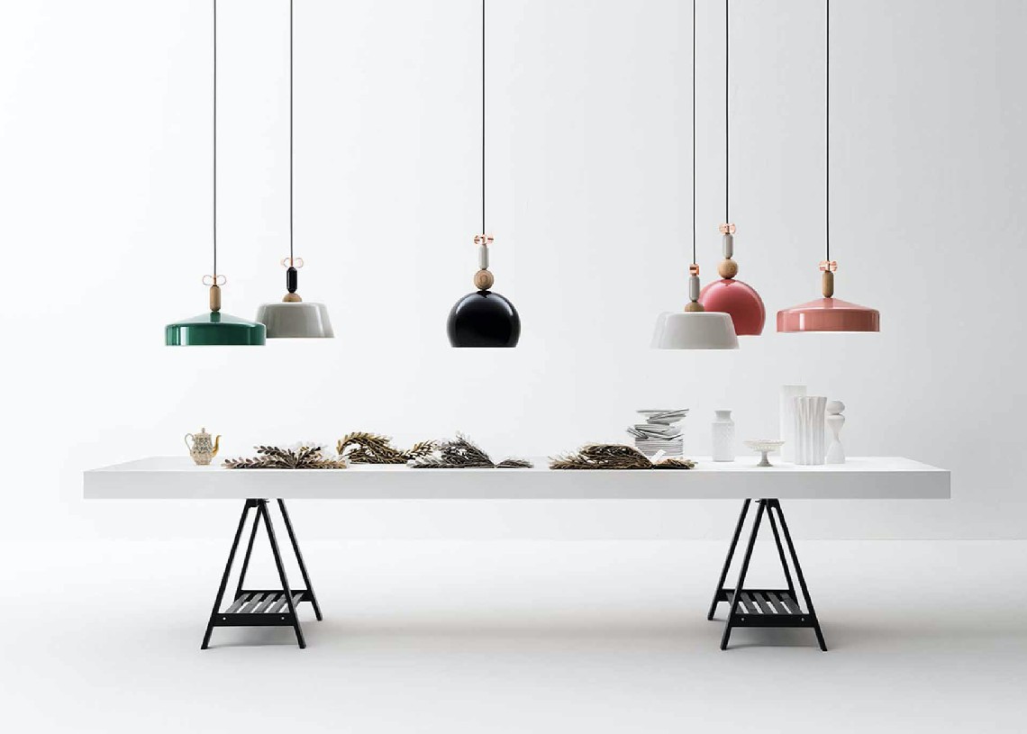 All’interno di questo scenario progettuale forme semplici e materiali diversi vengono sovrapposti a disegnare lampade intese come pezzi di gioielleria sospesi. I volumi elementari sovrapposti lungo il cavo creano micro architetture in foggia di pendenti. La composizione si chiude all’estremità con un ricciolo in ottone naturale o in rame a farfalla, chiara allusione al riferimento progettuale.