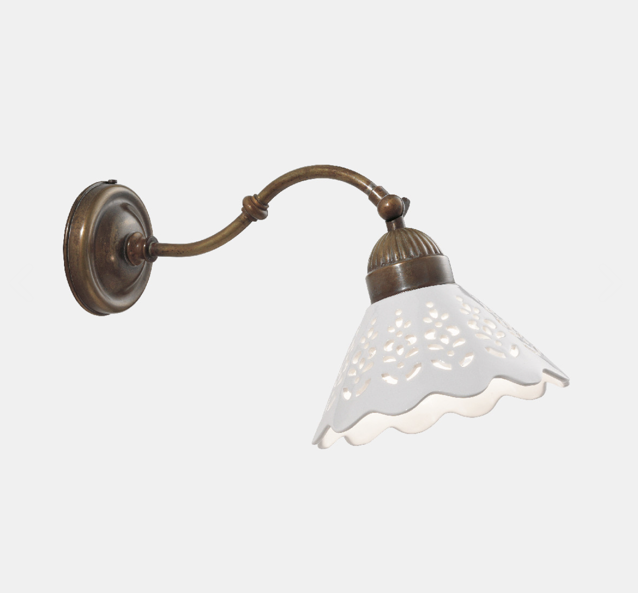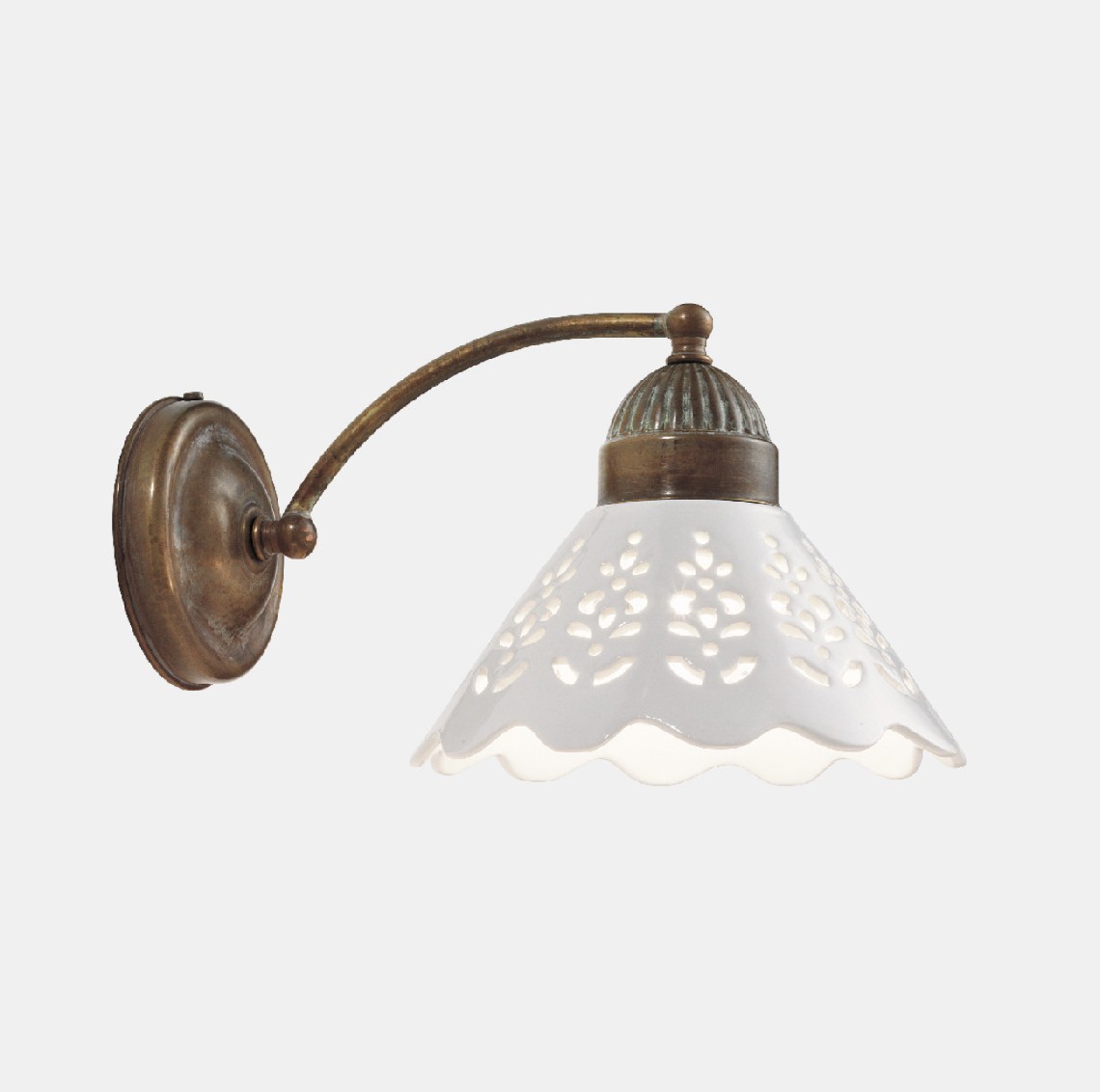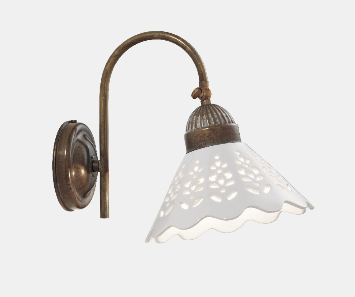 I ricami sapientemente traforati sulle preziose ceramiche di Bassano conferiscono un grande valore estetico alle lampade della collezione Fiori di Pizzo, emblemi di un classicismo rivisitato in chiave moderna. La ricercata lavorazione consente, in fase di illuminazione, la creazione di giochi di luce sulle pareti proiettando fiori e decori.