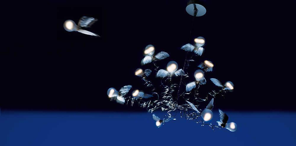 Metal, goose-feather wings, seven LED-bulbs.