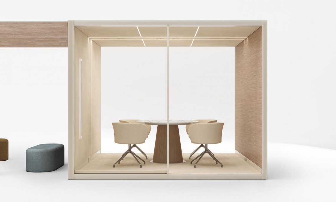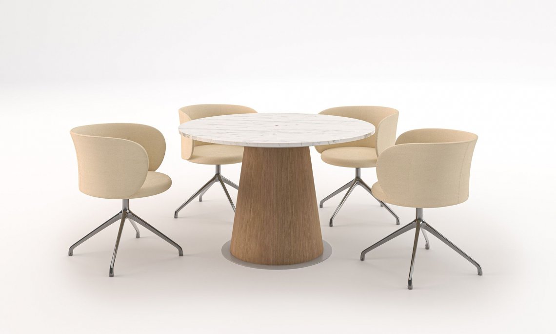 Duomo is the perfect meeting table for the office environment. It’s very adaptable, perfectly at home in a meeting room or used in a private office as an accessory table to the main desk. The supporting structure forms a single semi-conical volume composed of wood-lined metal. The structure can be easily accessed if and when it’s necessary to carry out some quick maintenance on the electrical system. The Carrara marble top possesses a central metal-lined hole for easy cable routing: maximum functionality combined with a clean, essential aesthetic. As it has a single central leg, a metal sub-top provides the table with added stability and, in matching the circular metal ground support base, it simultaneously bestows a touch of formal elegance.