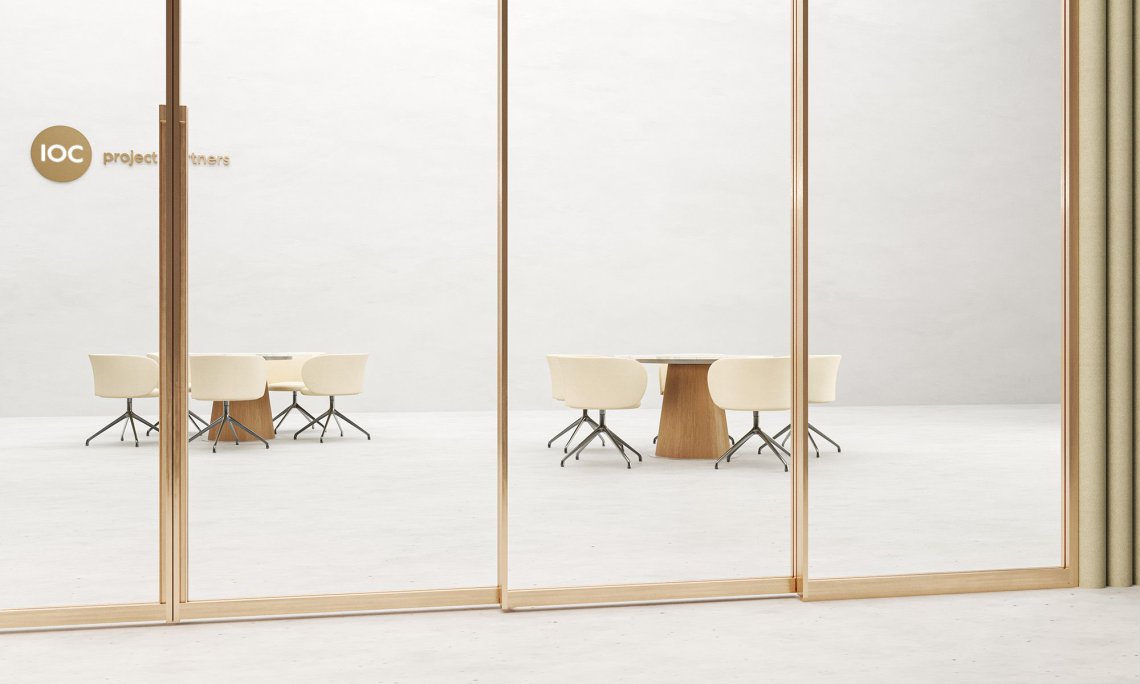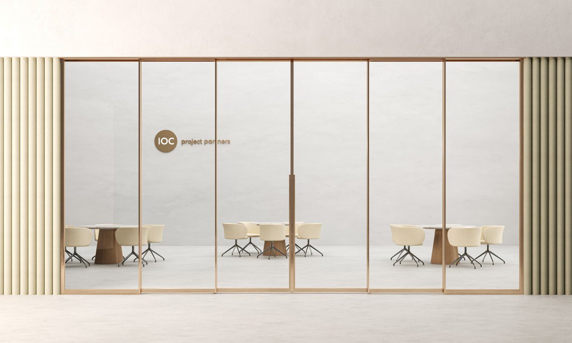 The Privé collection now includes a new dividing wall with synchronised telescopic opening. Privé, with its sliding module system, enables workspaces to be transformed, divided or opened, rendering them suitable for a range of functions: representative spaces, meeting rooms, executive offices or private areas. It consists of perfectly overlapping glass modules with a light aluminium frame or wooden panels which simultaneously slide with smooth, silent movements. The synchronised telescopic wall can be composed of one fixed and a maximum of three sliding modules, creating a partition of up to 4.6 m. Two mirrored groups of sliding modules can cover a distance of up to 9.2 m.