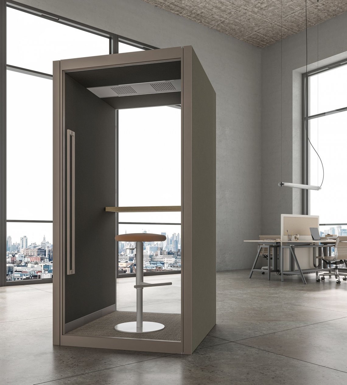 Privé is a system of soundproof, self-supporting booths, designed to create a private, protected area within open spaces, which are often noisy. It's both modular and customisable, and is the answer whenever privacy is required, be it visual or acoustic, making it possible to create the optimal working conditions.