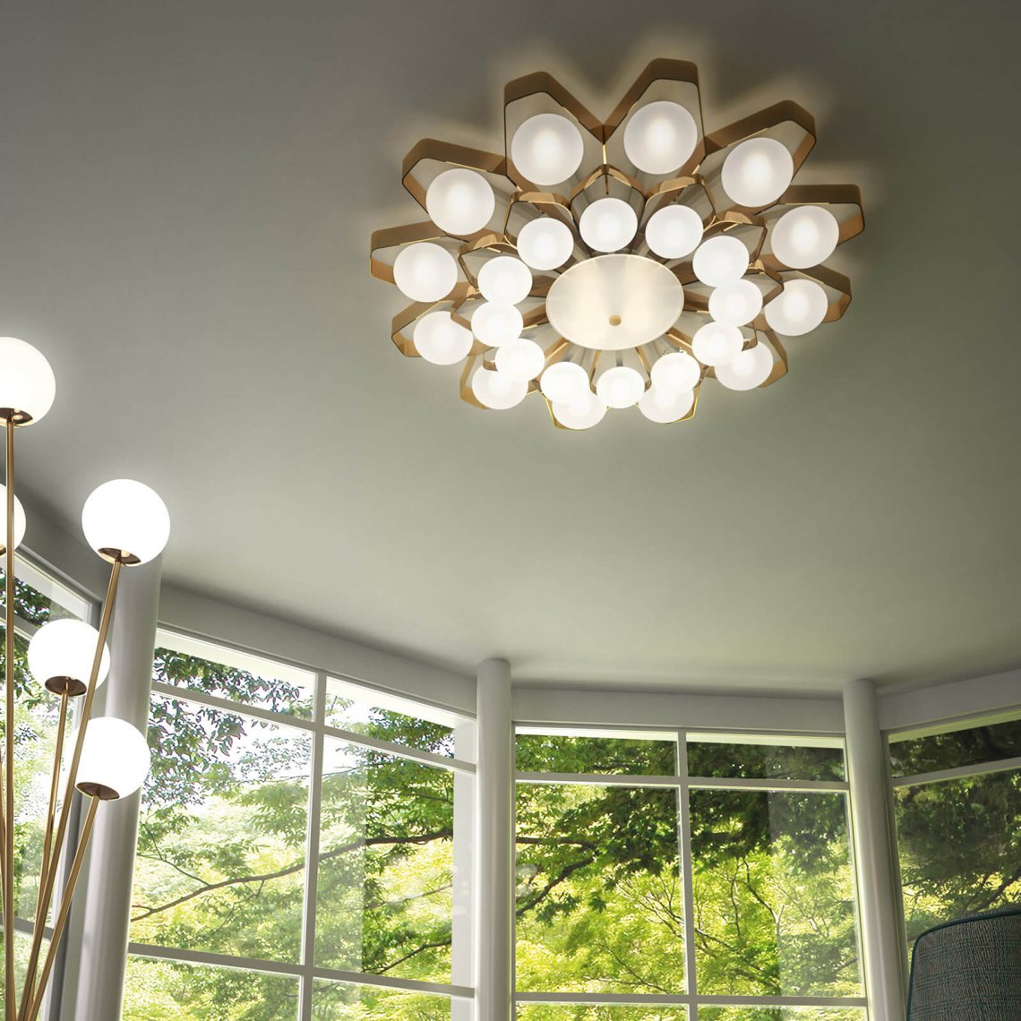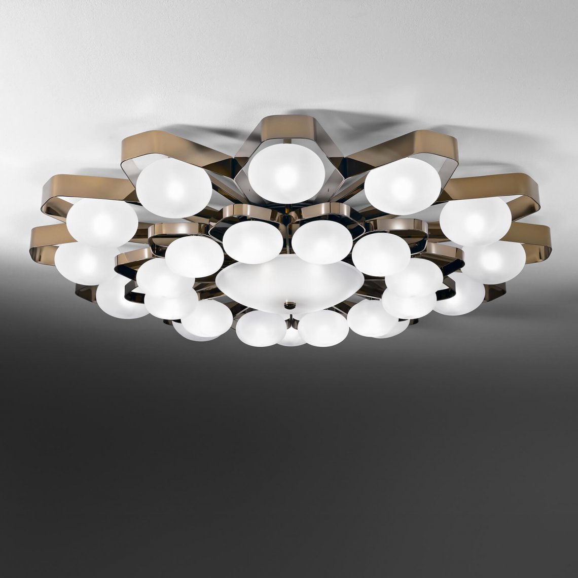 Ceiling lamp in nickel gold metal and blown satin glass diffusers. Available in different dimensions and colours. Incanto Modern Collection.