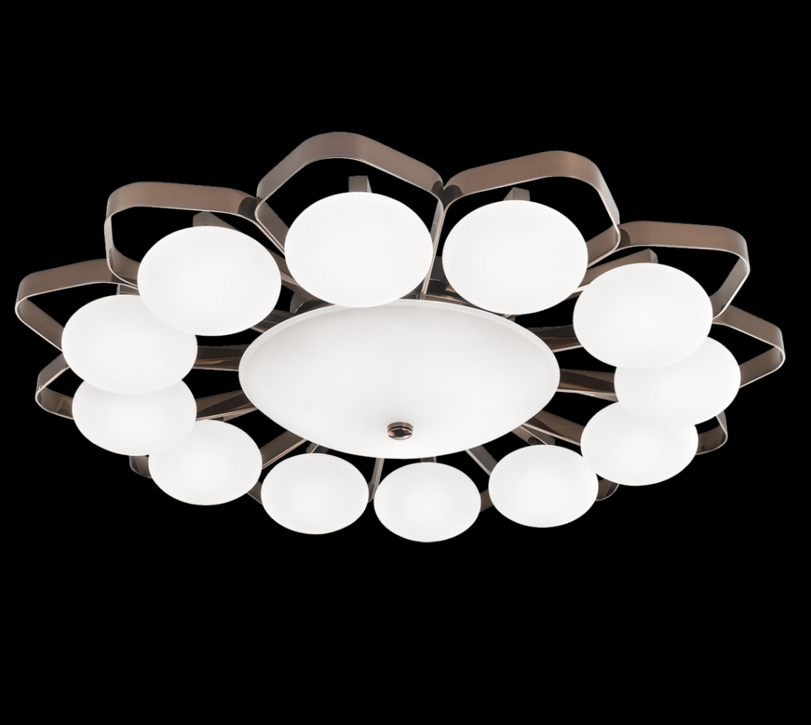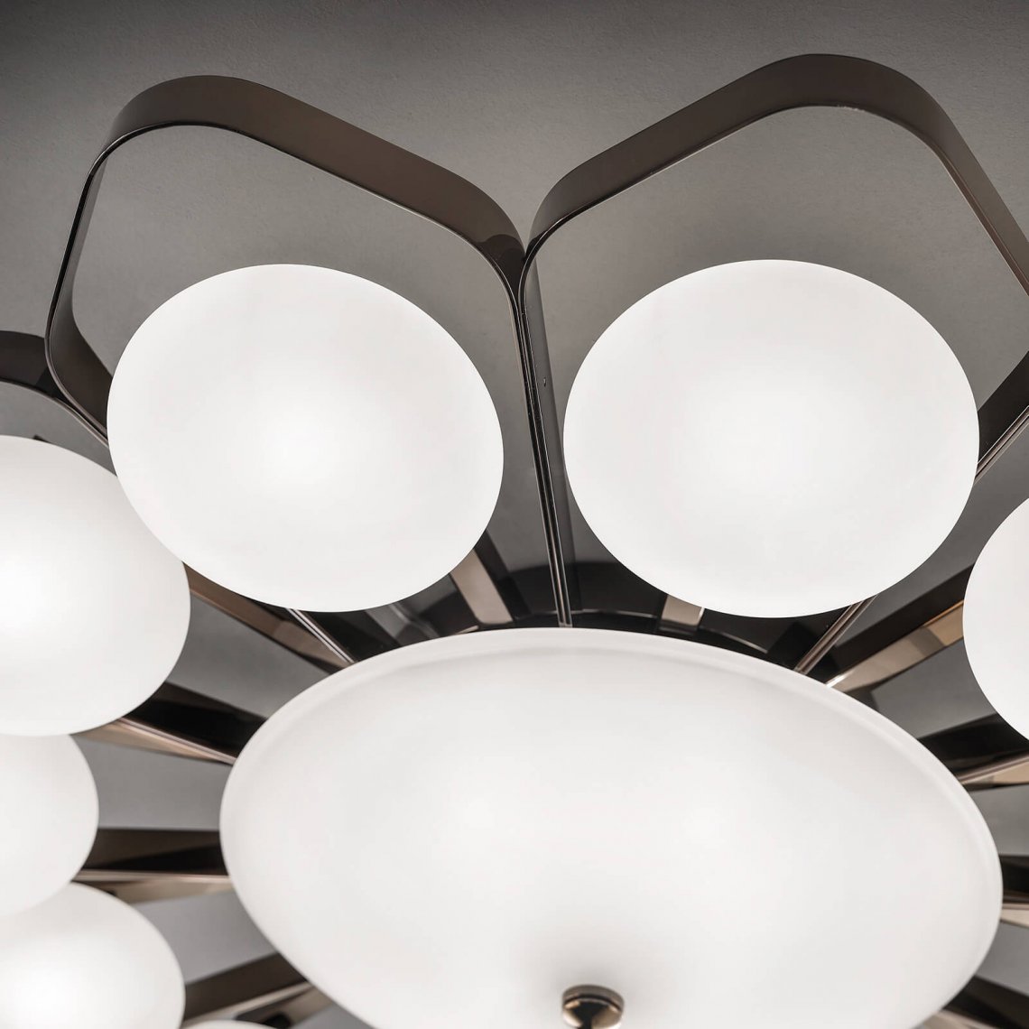 Ceiling lamp in nickel gold metal and blown satin glass diffusers. Available in different dimensions and colours. Incanto Modern Collection.
