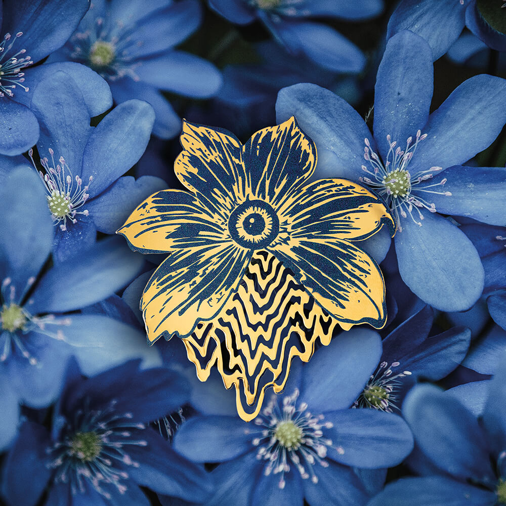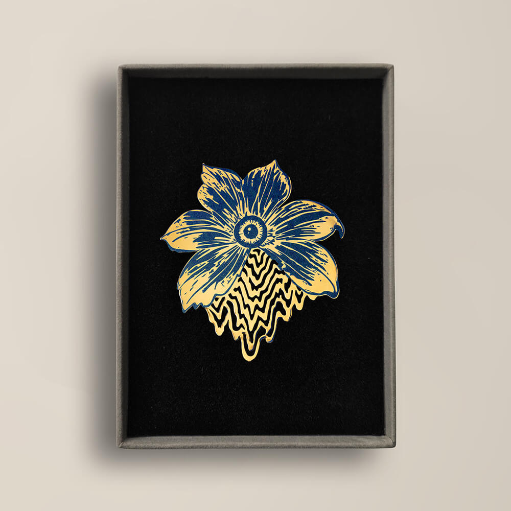 Hope is a gold-plated brass brooch with a pin that can be worn on a jacket, scarf, hat or piece of clothing. This flower brooch by artist Aurel Rubbish is a true artistic statement. This subtly elegant jewel evokes the balance between the power and fragility of nature.
