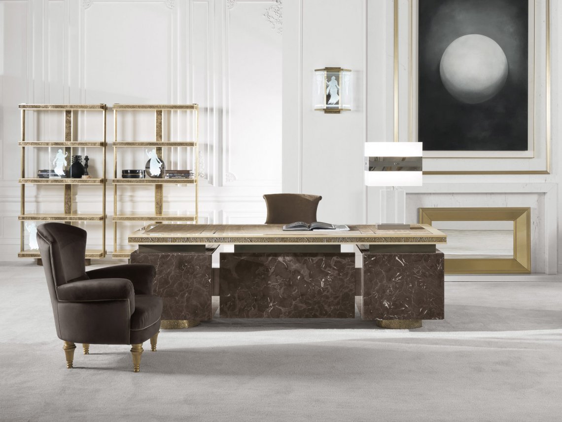 ARMCHAIR WITH STRUCTURE IN BEECHWOOD. PADDING IN FOAM. UPHOLSTERY IN FABRIC. FEET IN WOOD WITH PATINATED ANTIQUE GOLD FINISHING.