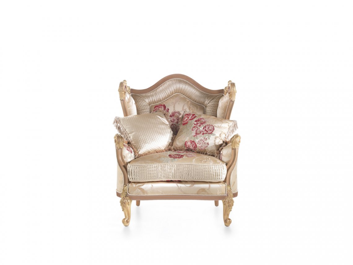 ARMCHAIR WITH STRUCTURE IN BEECHWOOD. PADDING IN FOAM. UPHOLSTERY IN FABRIC WITH DECORATIVE FRINGE.