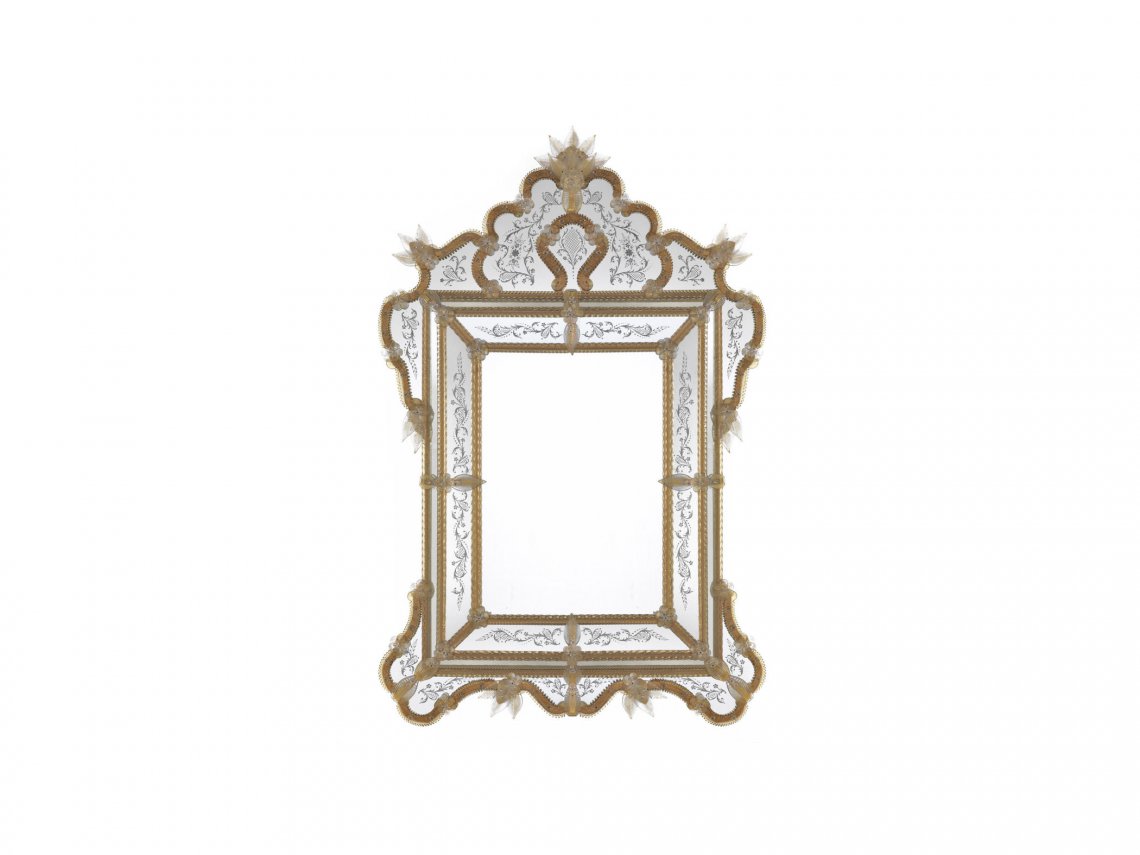 VENETIAN SPECIAL MIRROR WITH ENGRAVED DETAILS AND AMBER GLASS FLOWERS.