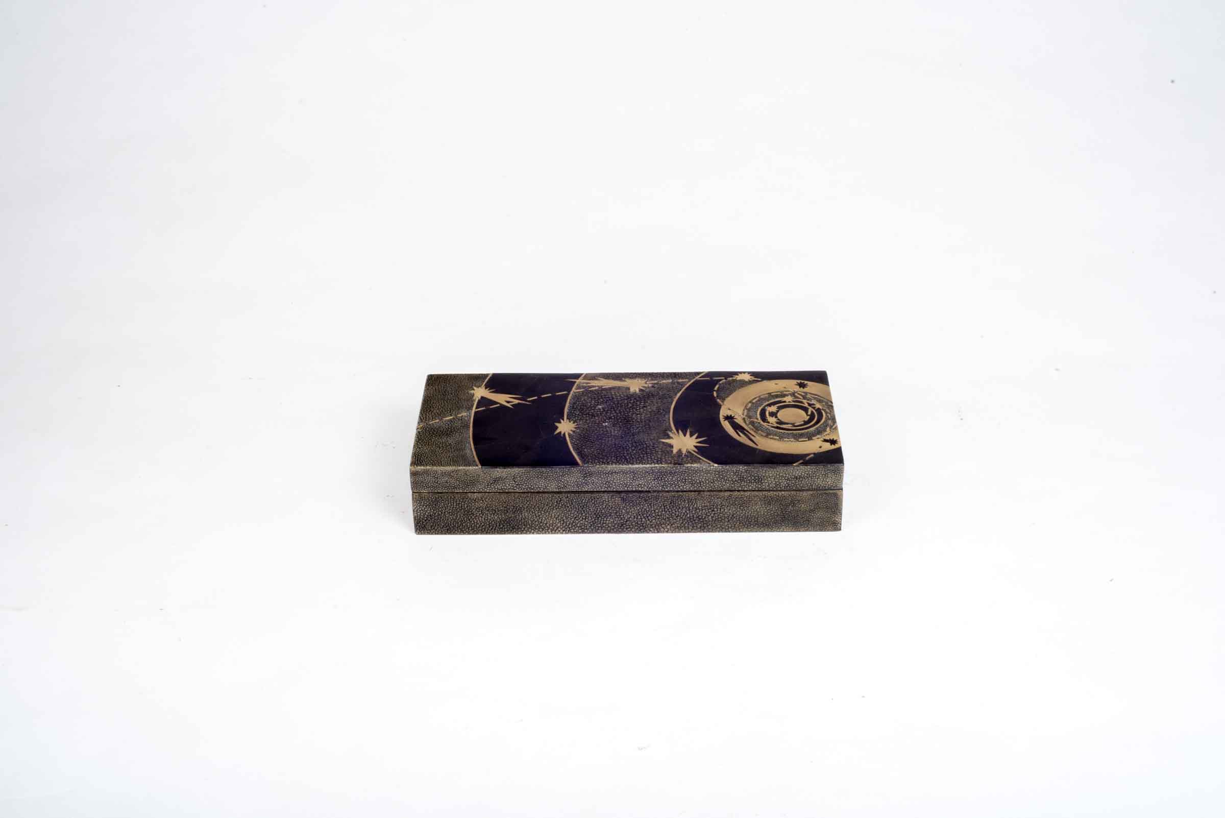 The Constellation Dark Rectangle Box showcases the signature whimsical details of KIFU PARIS. This piece includes intricate inlay work of shagreen, pen shell & bronze patina brass to create this stunning pattern. Available in other sizes and different finishes.