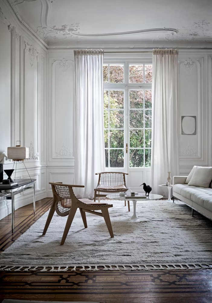 Expertly crafted from natural materials, the graceful form of the Klismos Lounge Chair welcomes the sitter with a scooped low-slung seat, precisely angled back, and wraparound armrests.