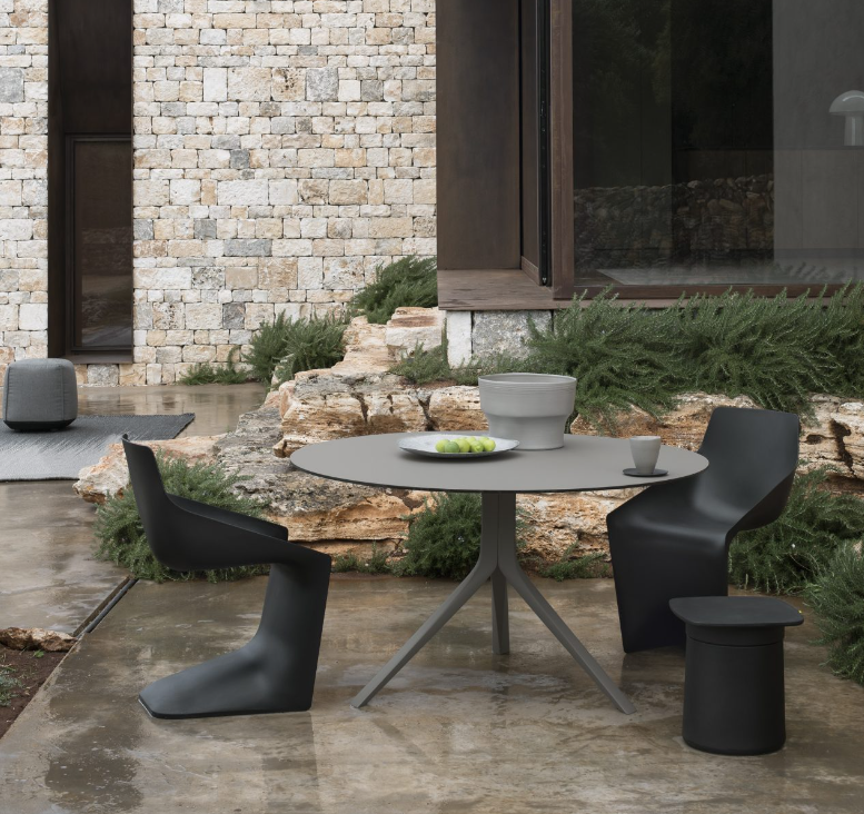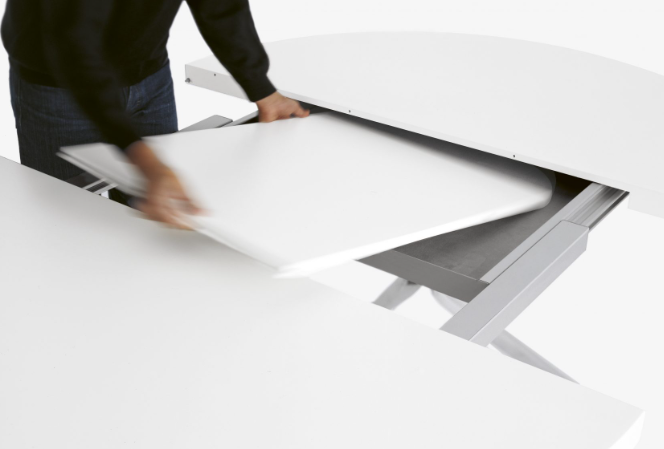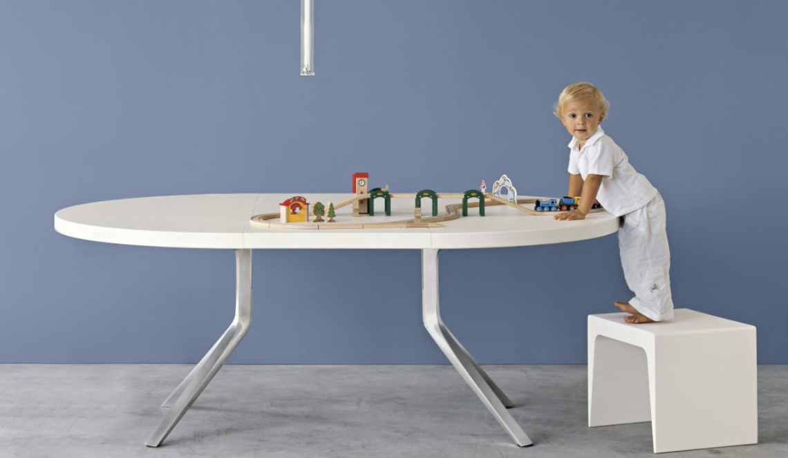 Designed by Monica Graffeo in 2006, Oops is an extendable table with an aluminium base and a 50mm thick lacquered top that extends from a round to an ellipsoidal shape. In technical terms, this table is impeccable when closed or open due to its aesthetic appeal and sturdiness. In 2016, the collection was extended: the Oops I Did It Again range now includes two fixed tables with a round top and a fixed table with a rectangular top, available in different sizes. The legs are made of die-cast aluminium with a brushed or powder-coated lacquer finish.