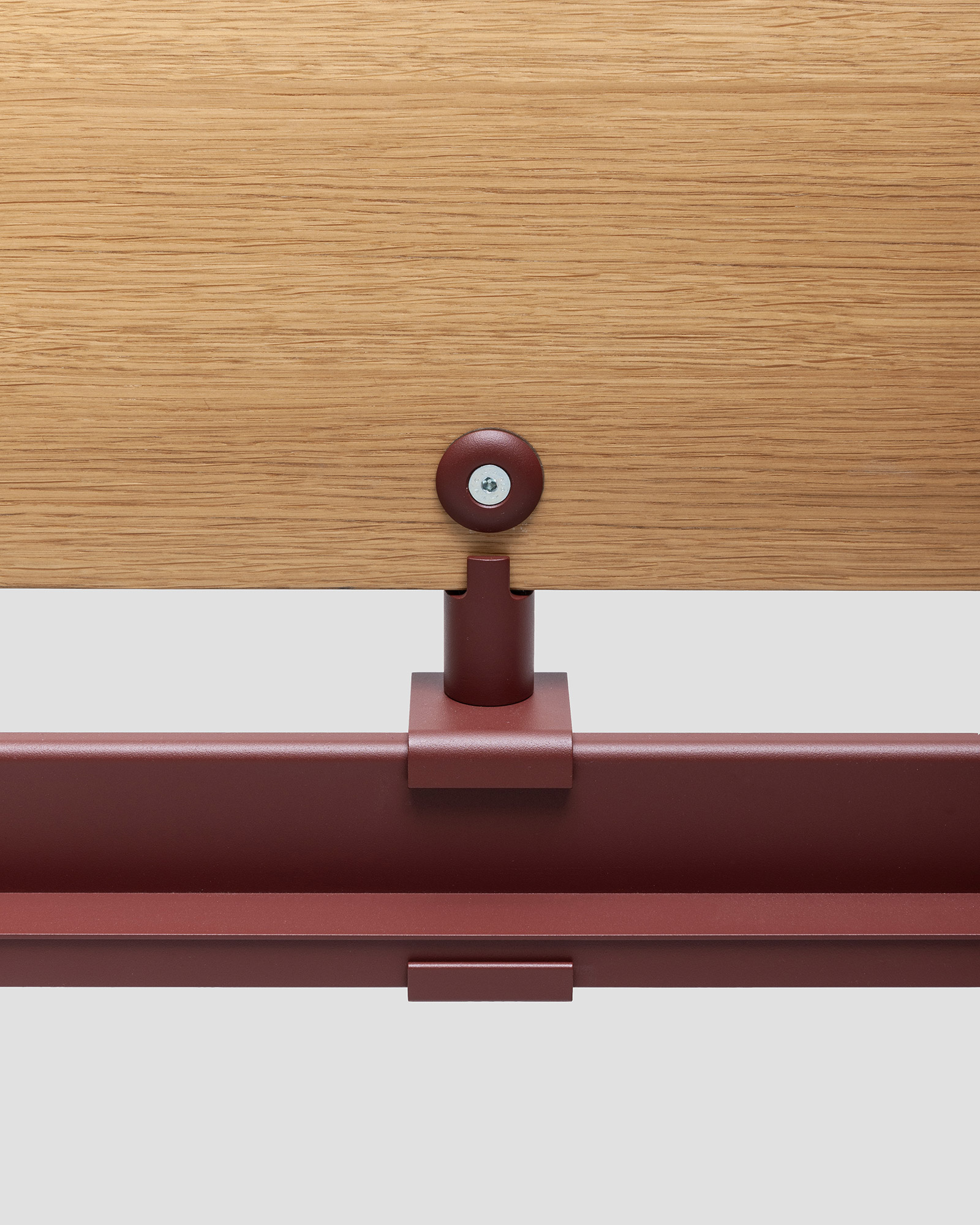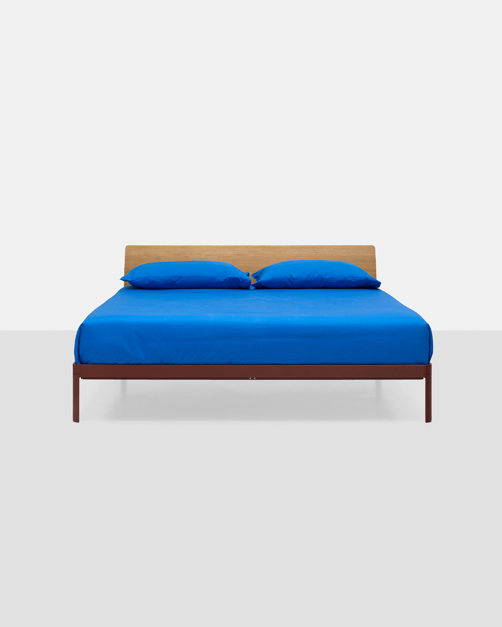 Reissue of the historic bed designed by Luciano Bertoncini in 2000. The structure is made of 100% recyclable aluminium, powder-coated, while the headboard is made of plywood or upholstered. Available in a compact package, is very simple to assemble and disassemble.