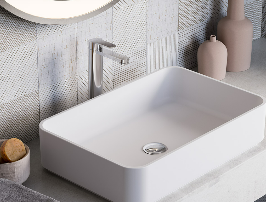 Countertop rectangular washbasin in matt colored Mineralmarmo or in matt white Solid Surface, with possibility of external Colour finish, glossy or matt.