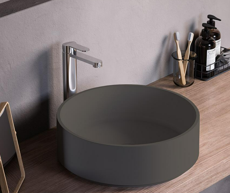 Countertop round washbasin in matt colored Mineralmarmo or in matt white Solid Surface, with possibility of external Colour finish, glossy or matt.