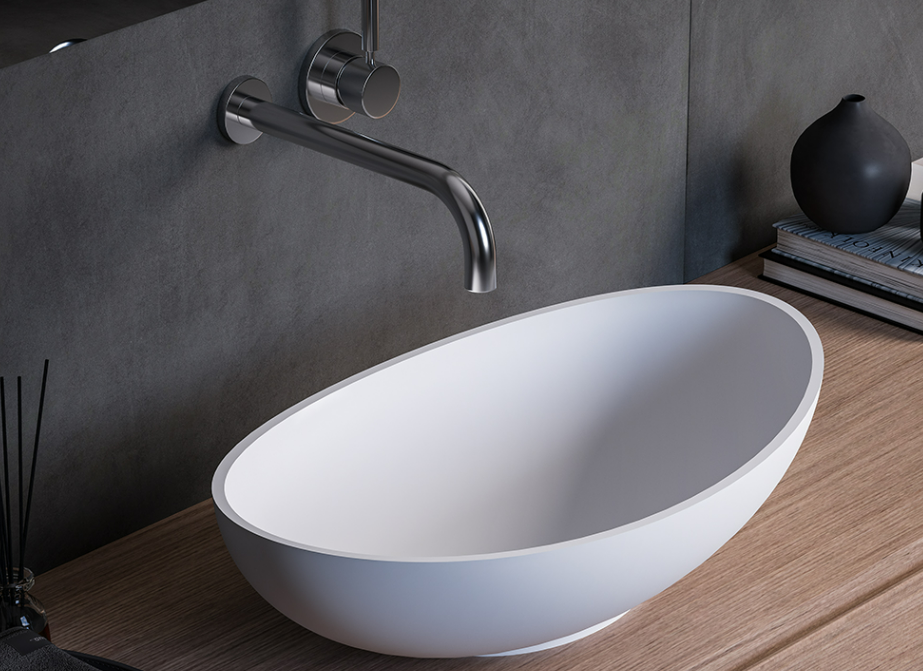 Countertop oval washbasin in matt white Solid Surface, with possibility of external Colour finish, glossy or matt.