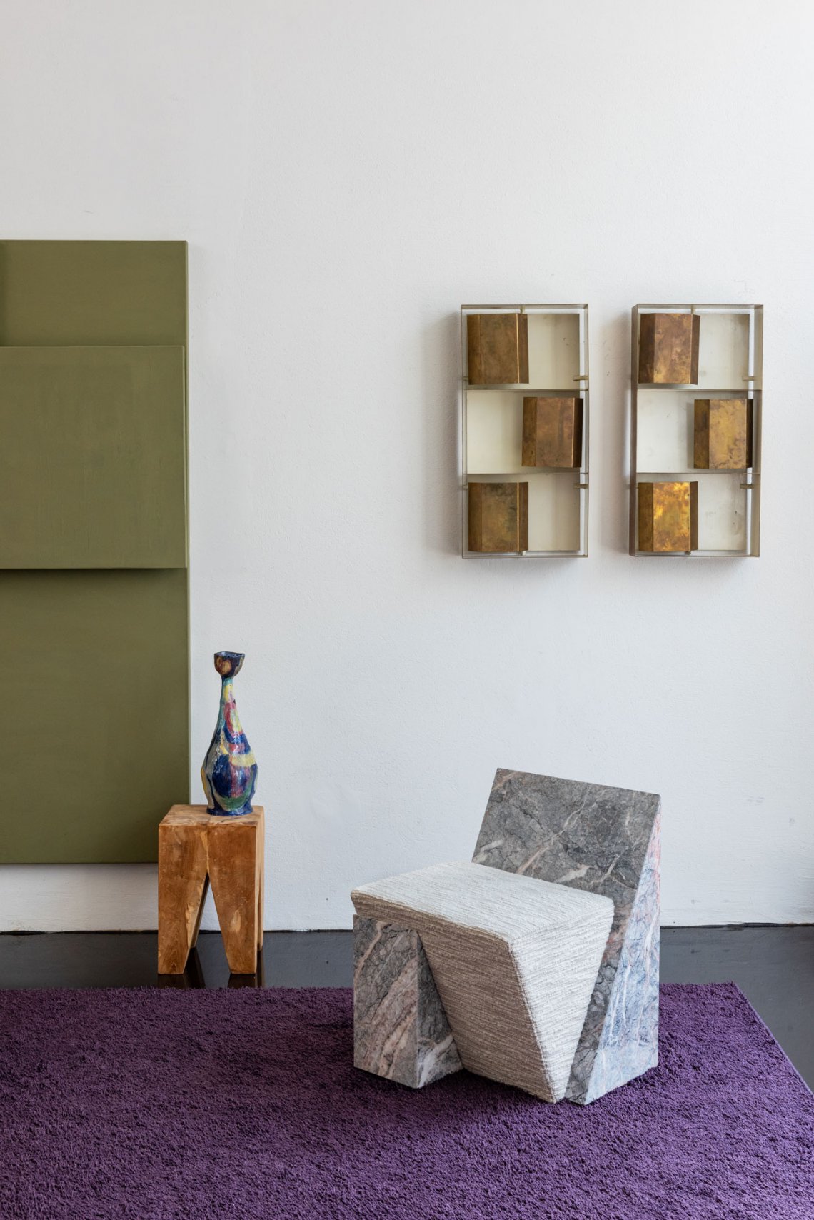 MARMINI II is despite its minimalistic architectural appearance a comfortable upholstered stool. It is composed of three volumes that apparently do not seem to be able to stay together, two hard parts in ‘Fior di Pesco’ marble that seem to want to detach themselves from the central part of the upholstered soft padding.