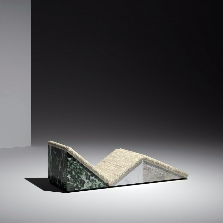 MARMINI I is an uncompromised architectural lounge chair built in Verde Alpi, Bianco Carrara and Fior di Pesco marble. To augment the seating comfort, an oversized cushion with a materic Lelievre fabrics covers the entire chaise longue.
