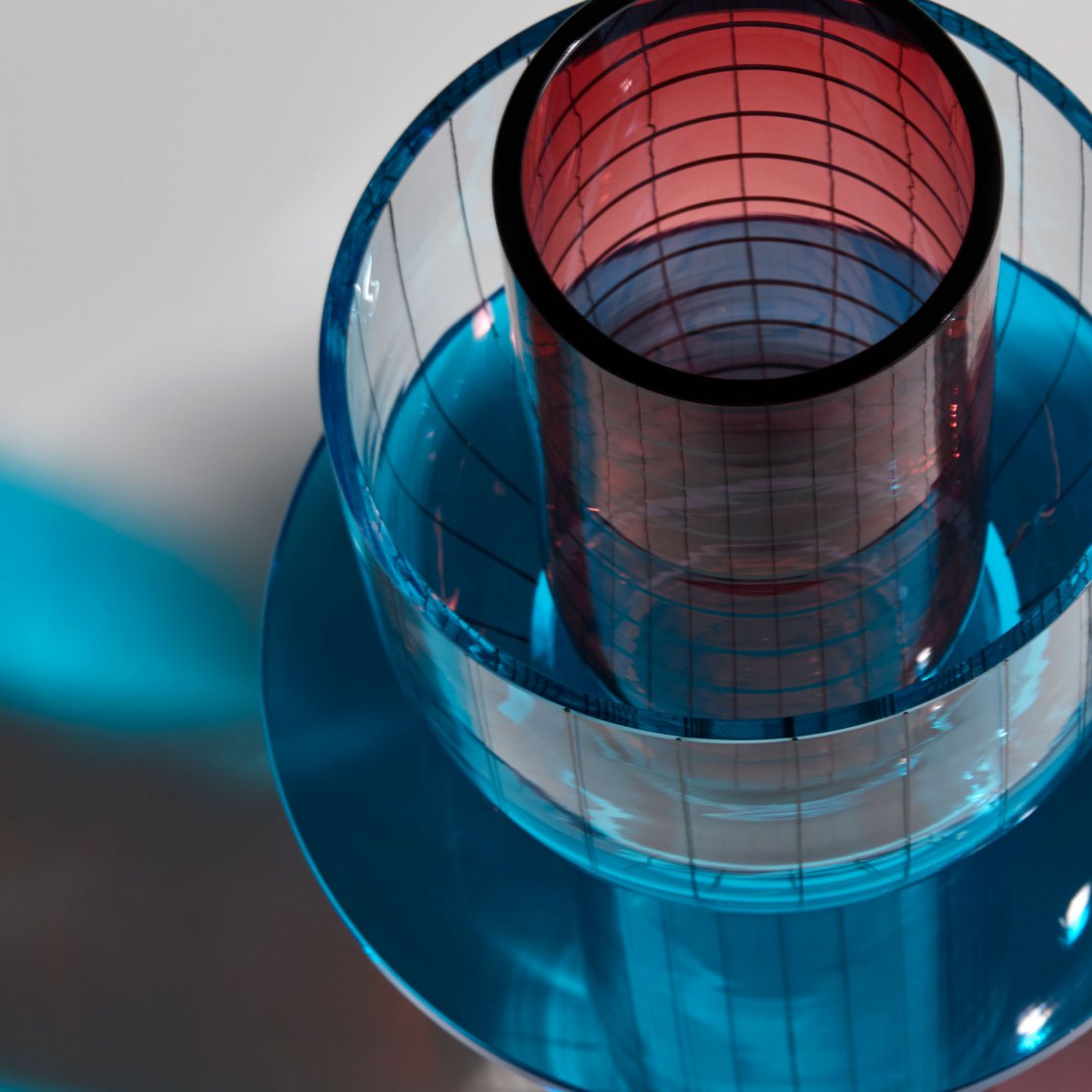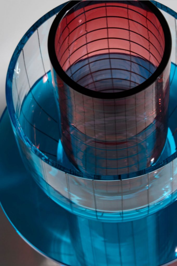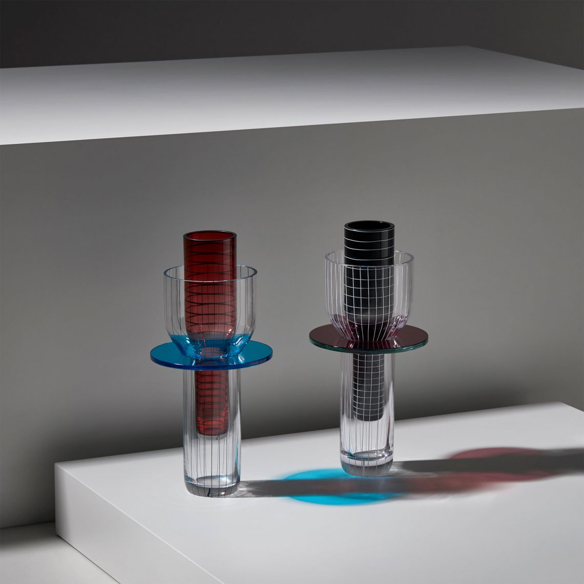 Toy is a sculptural vase in blown glass with hand painted decors. The vase is made of two pieces whose painted lines interact, creating color combinations, distortions, patterns and reflections on the vase.