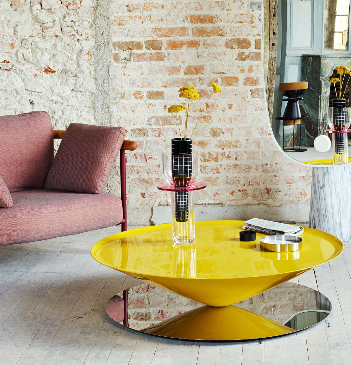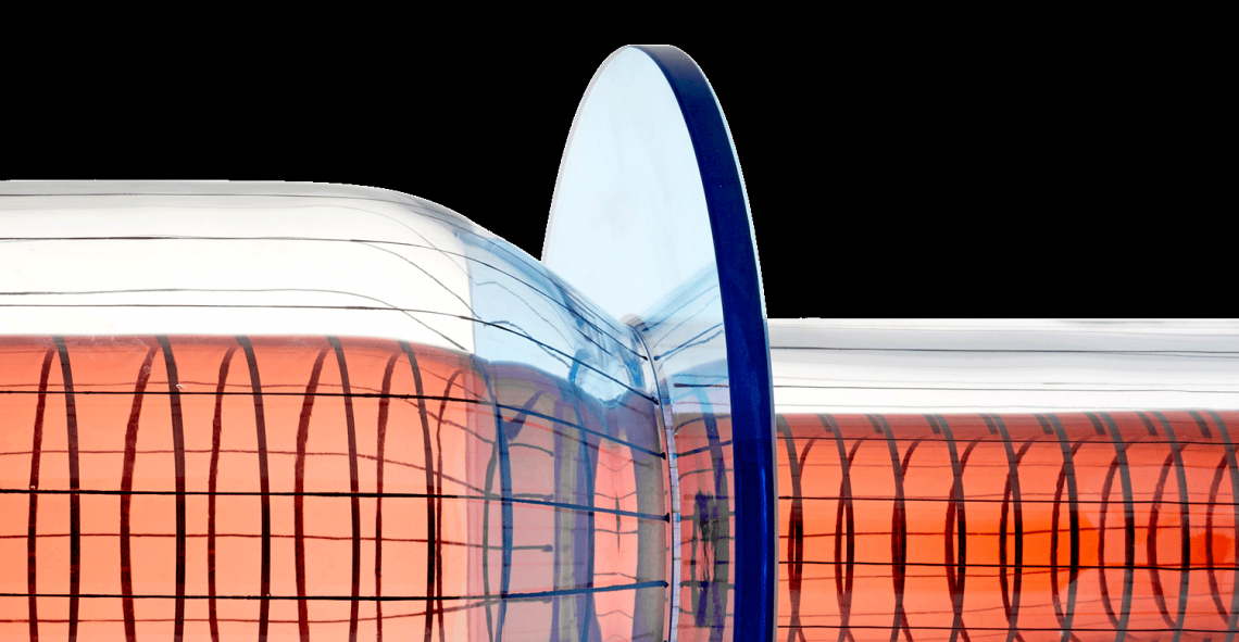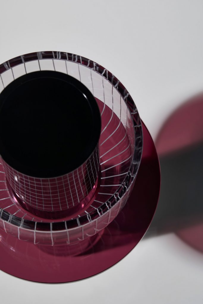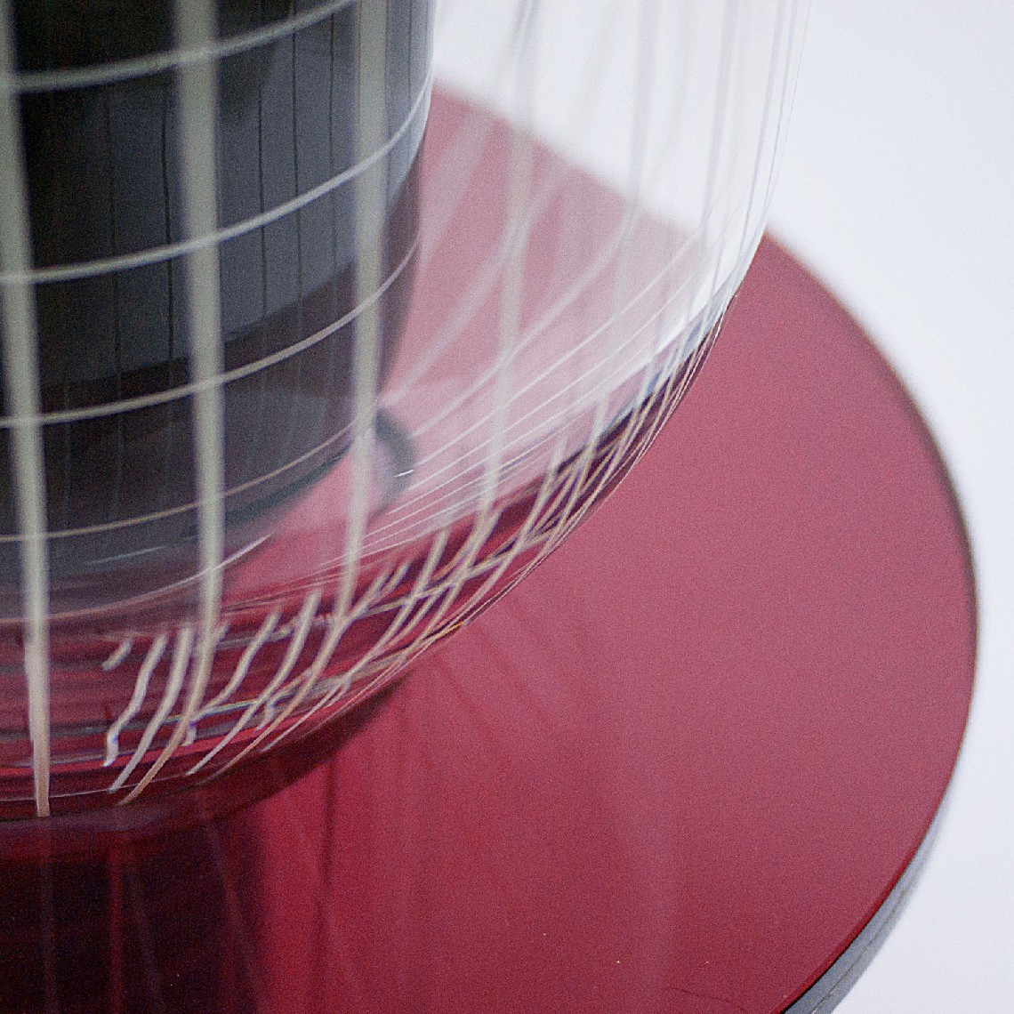 Toy is a sculptural vase in blown glass with hand painted decors. The vase is made of two pieces whose painted lines interact, creating color combinations, distortions, patterns and reflections on the vase.