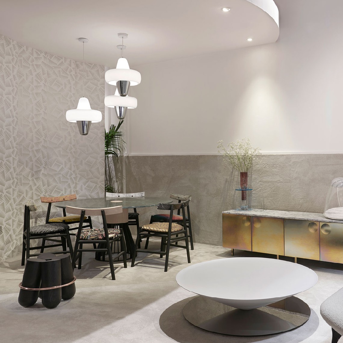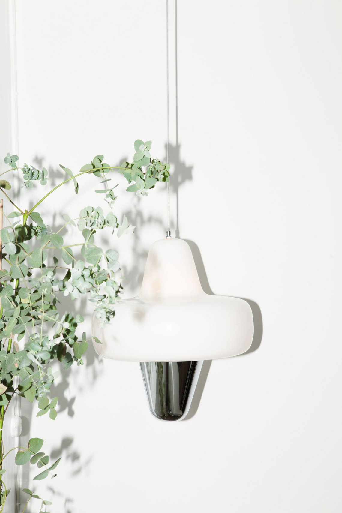 Swan is a large pendant lamp with smooth and curvy lines. Swan is made of an opalescent shade in blown glass floating above a chromed metal cone.