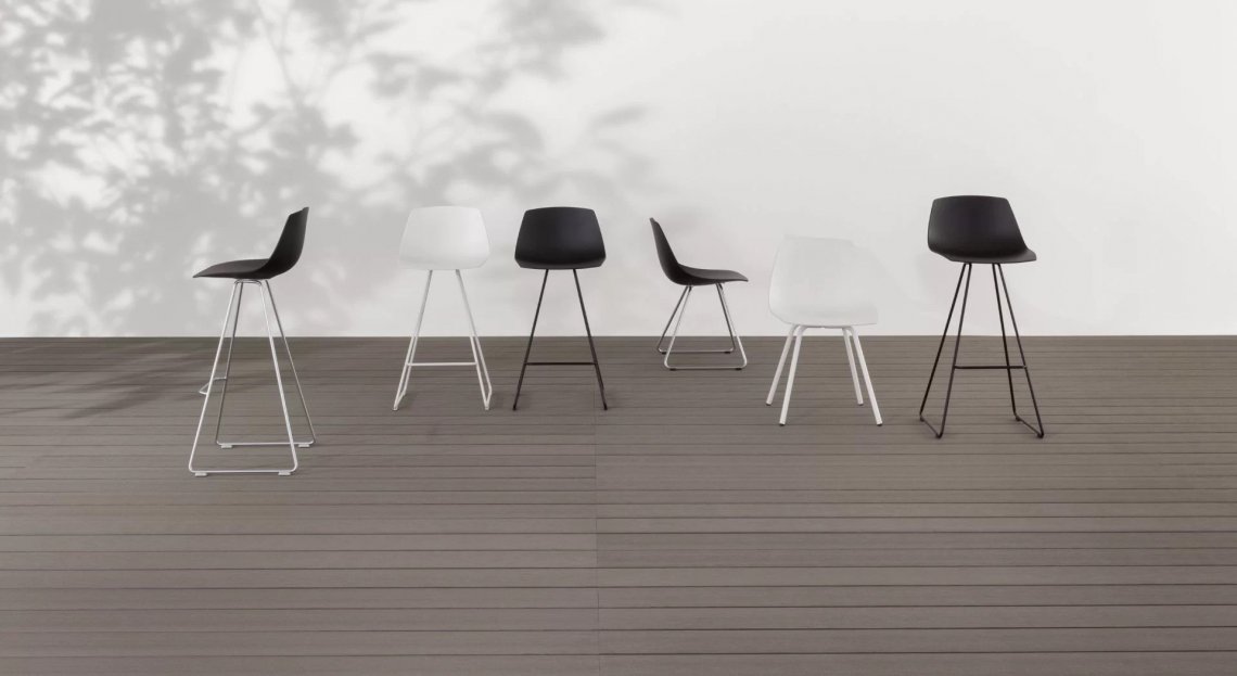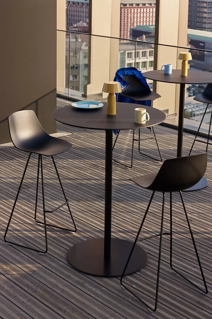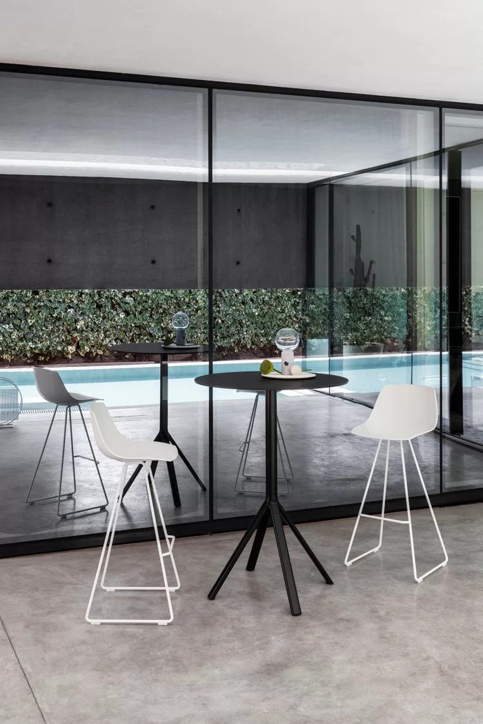 Conviviale ed elegante, lo sgabello MIUNN ad altezza fissa trasforma ogni ambiente outdoor in uno spazio di frizzante serenità. Nel profilo sinuoso, la seduta in Baydur? offre un sostegno naturale alla schiena e si unisce al telaio a slitta in acciaio inox, che completa l’assoluta leggerezza del disegno.