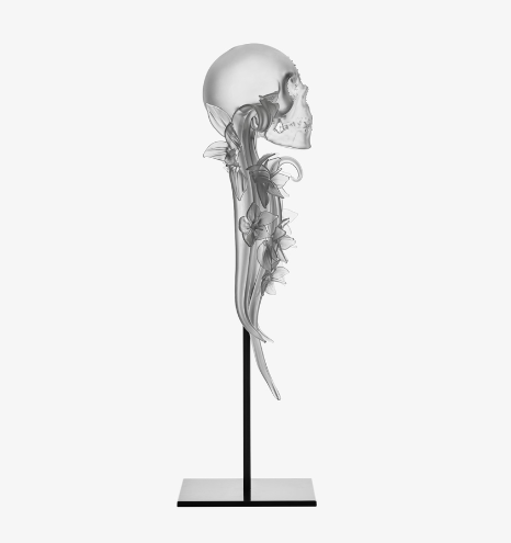 Morana doesn’t hide her scary face – after all, she is the embodiment of a soul of a deceased woman that came to Earth to celebrate with her former family Mexico’s festival of the Dead. The sandblasted skull with a dotted cross on its forehead is the centerpiece of a statue garnished with delicate flowers. Macabre yet fascinating, the glass statue follows the onlookers with a magnetic, mystical gaze.