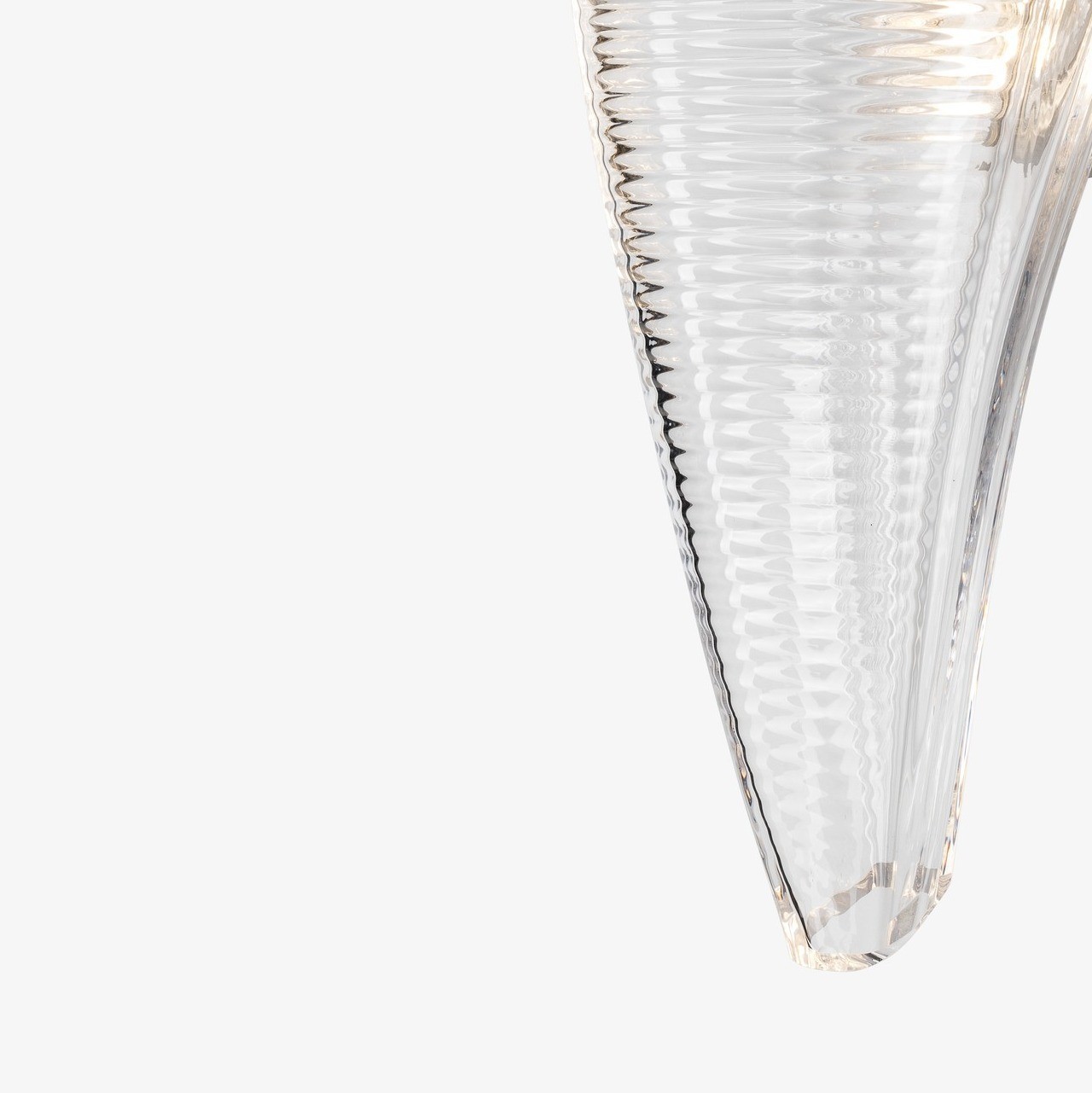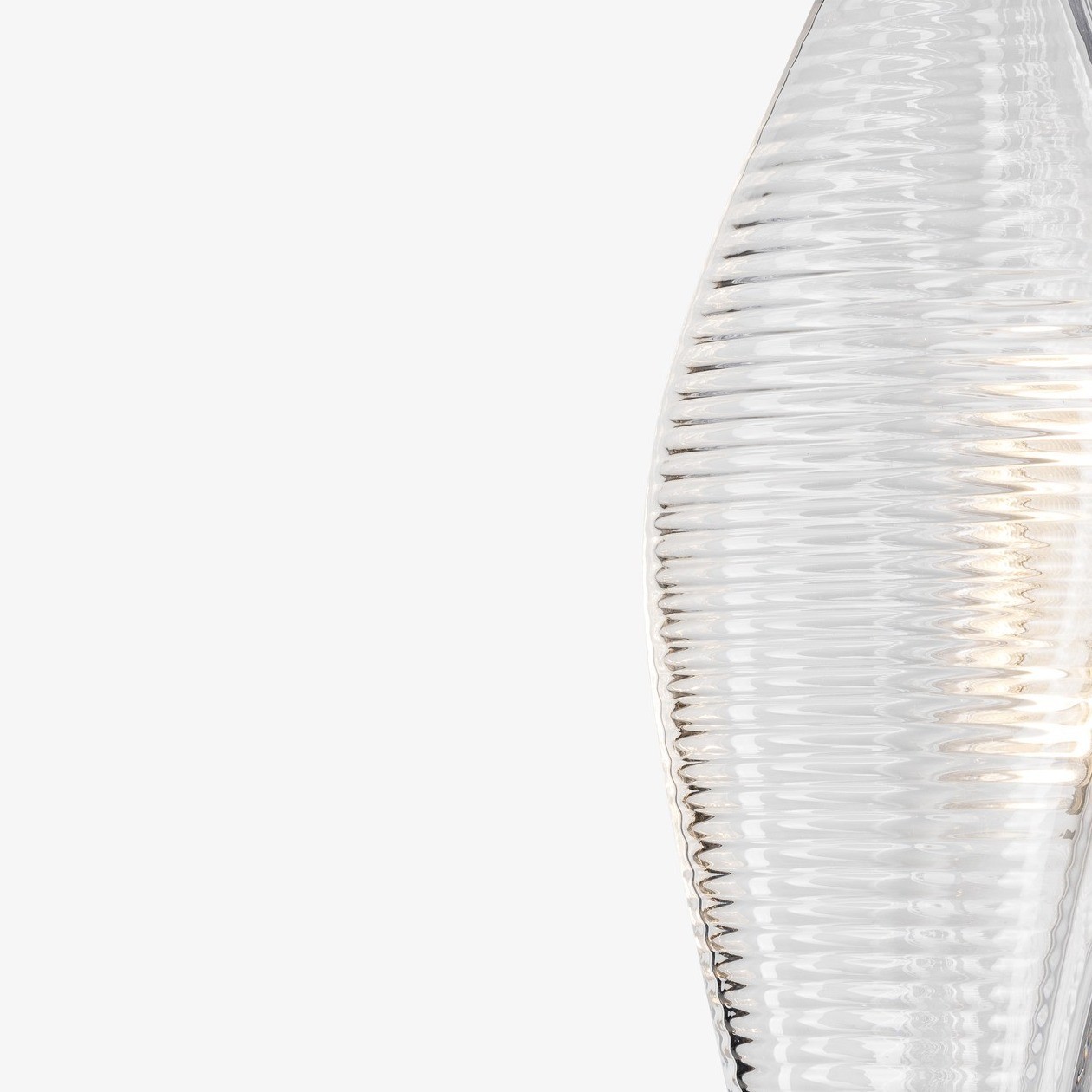 Duna was inspired by the coherent yet abstract logic of dune formations that defy traditional Cartesian geometries. Its design concept is realized in a three dimensional, asymmetrical, pair of intersecting glass forms. The striated surface of the crystal glass produces ever-changing effects of reflection and refraction. Narrowly directed light sources beam light through the mass of glass into the entire glass element, highlighting its geometry.