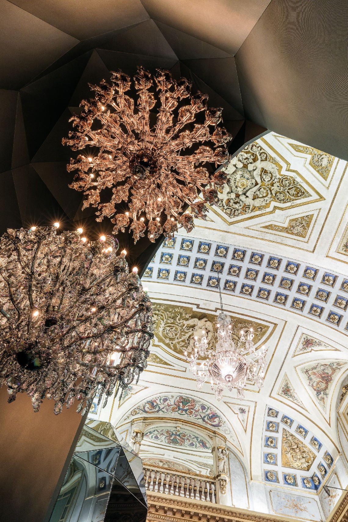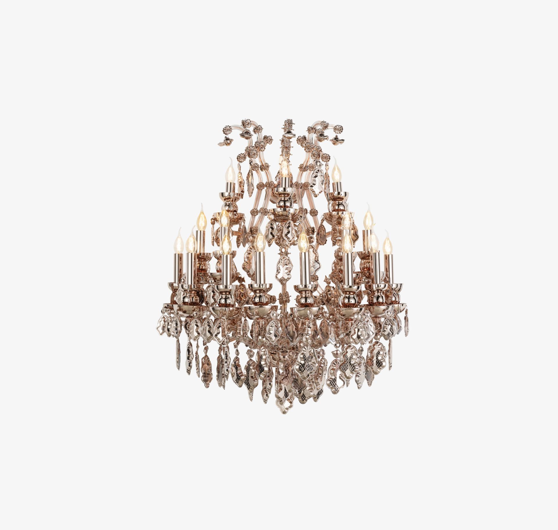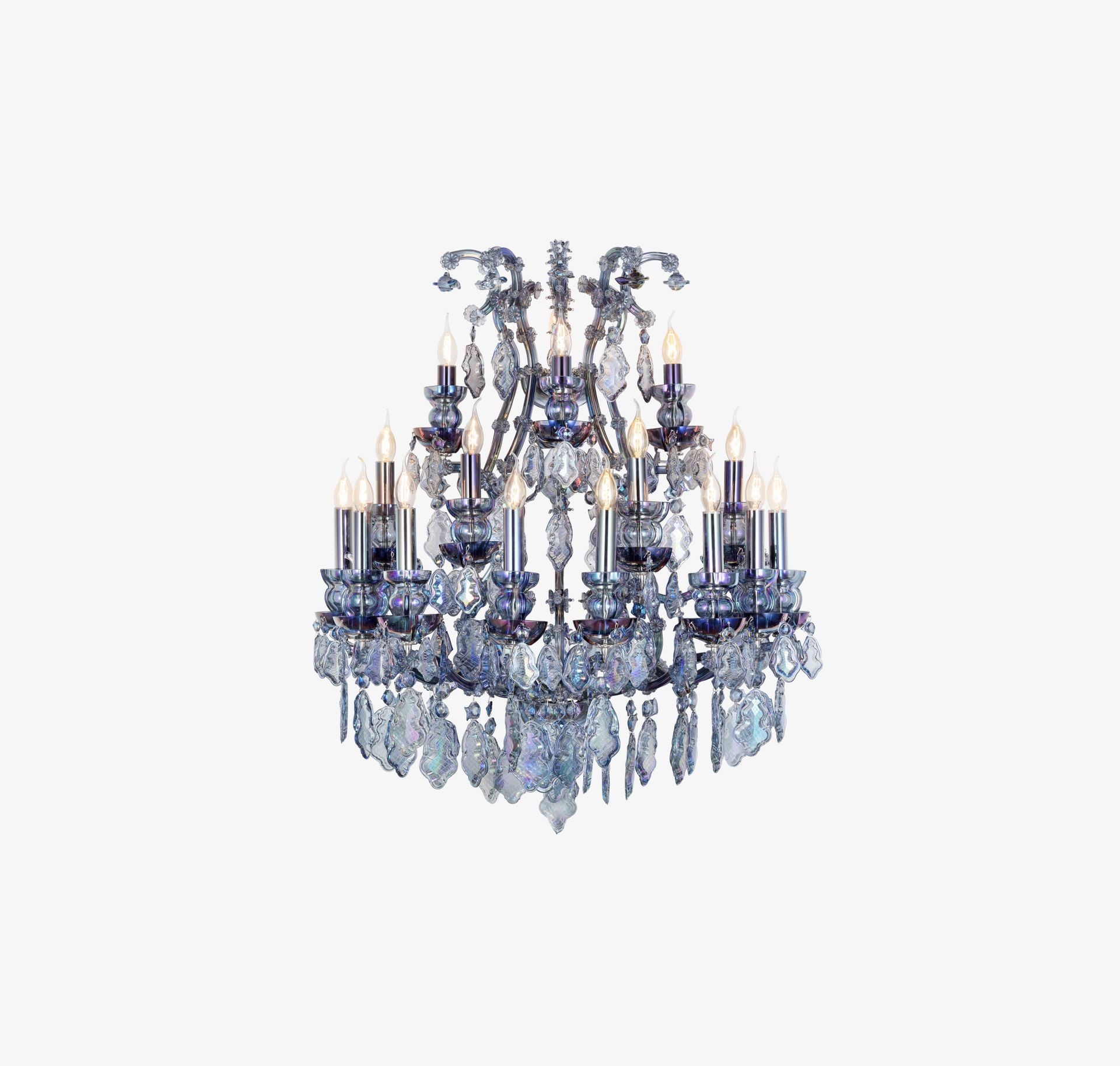 Inspired by the traditional shape of chandeliers popular during the reign of Empress Maria Theresa, this contemporary reflection on the iconic style brings refreshing new details. The production of its individual trimmings is stopped prior to their final cutting and polishing, showing the pressed glass including its overburden edge. The Empress chandelier is an example of excellent craftsmanship in combination with the raw sense of the unfinished trimming.