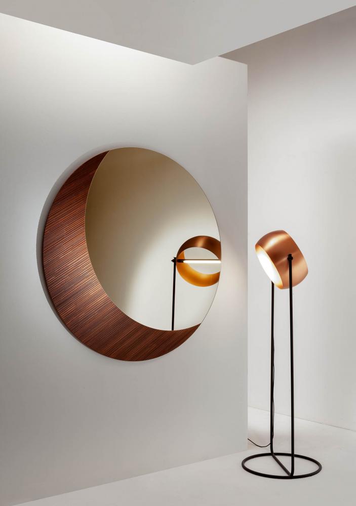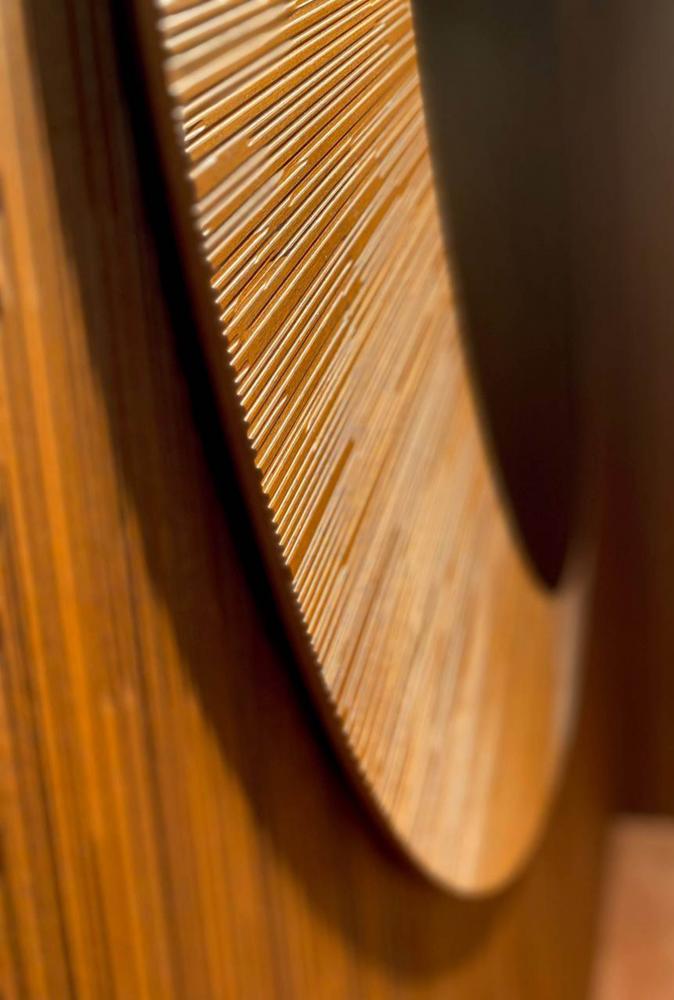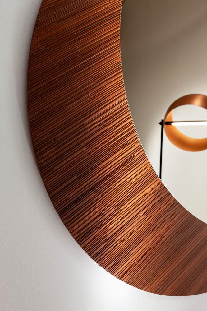 Round mirror with wooden frame and frontal panel decorated with Decor carving on the sight side. It is available in all woods of the collection, with a Liquid Metal finish and in special dimensions.