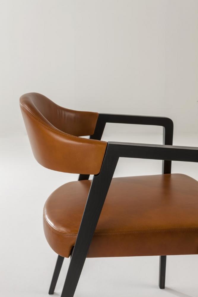 Chair with legs and armrests in plain, dyed or lacquered wood, and with seat and backrest upholstered in leather, velvet, or fabric.Legs adorned with vertical wood inlay.