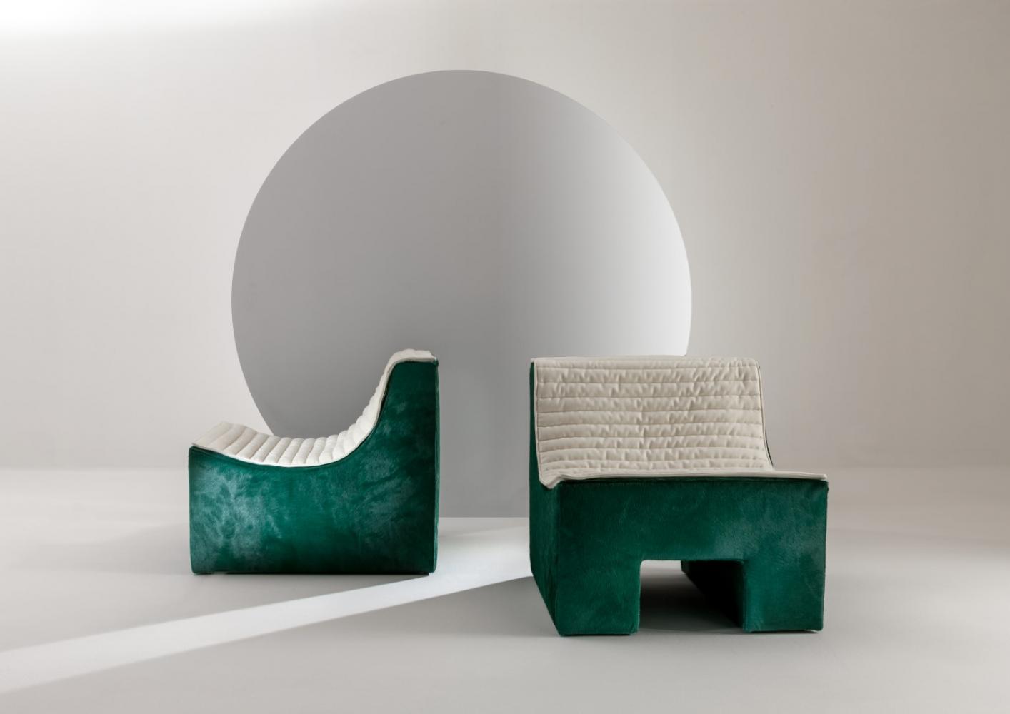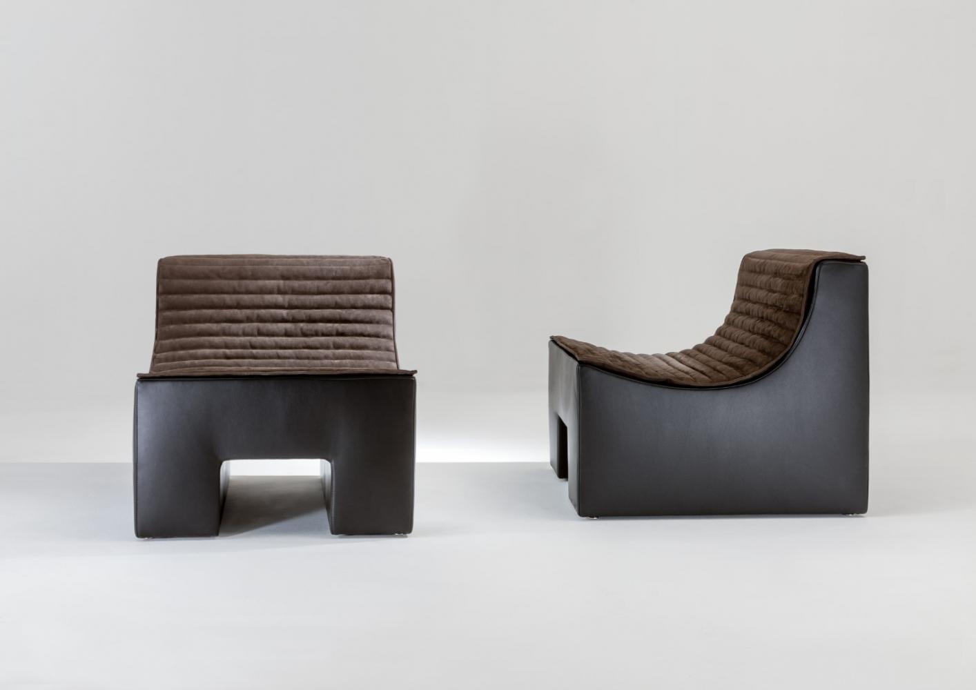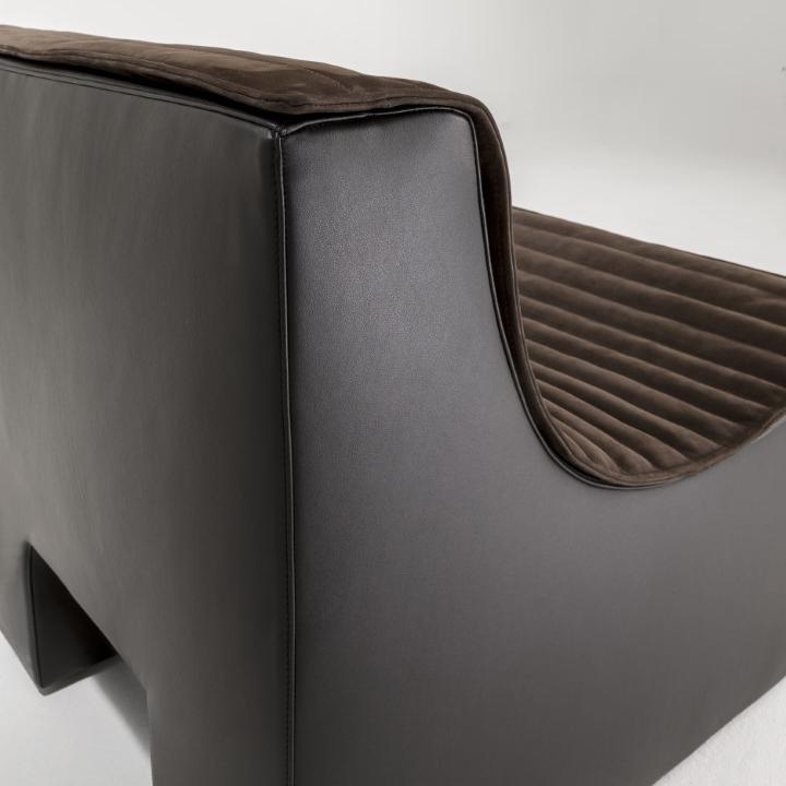 Armchair with fully padded structure upholstered in leather, velvet, or fabric.