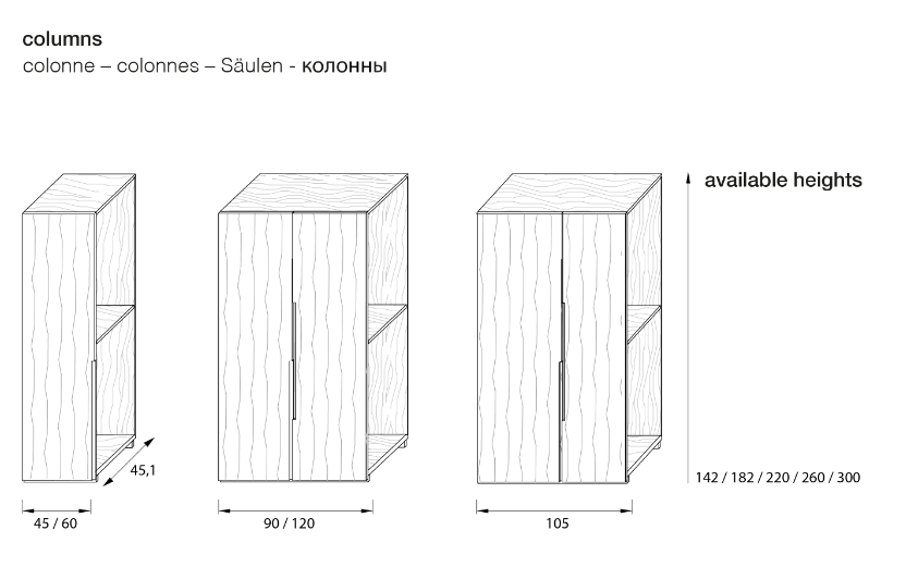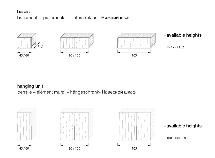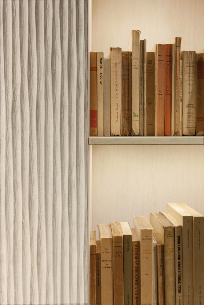 Wooden cabinet system with Onda carving available in modules of different sizes, in all the wood finishes of the collection and in aniline-stained oak in all RAL colours. The system is available with horizontal and vertical carving.