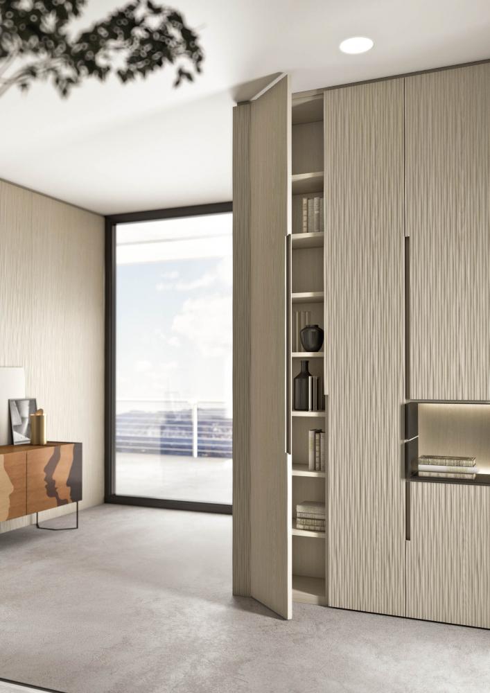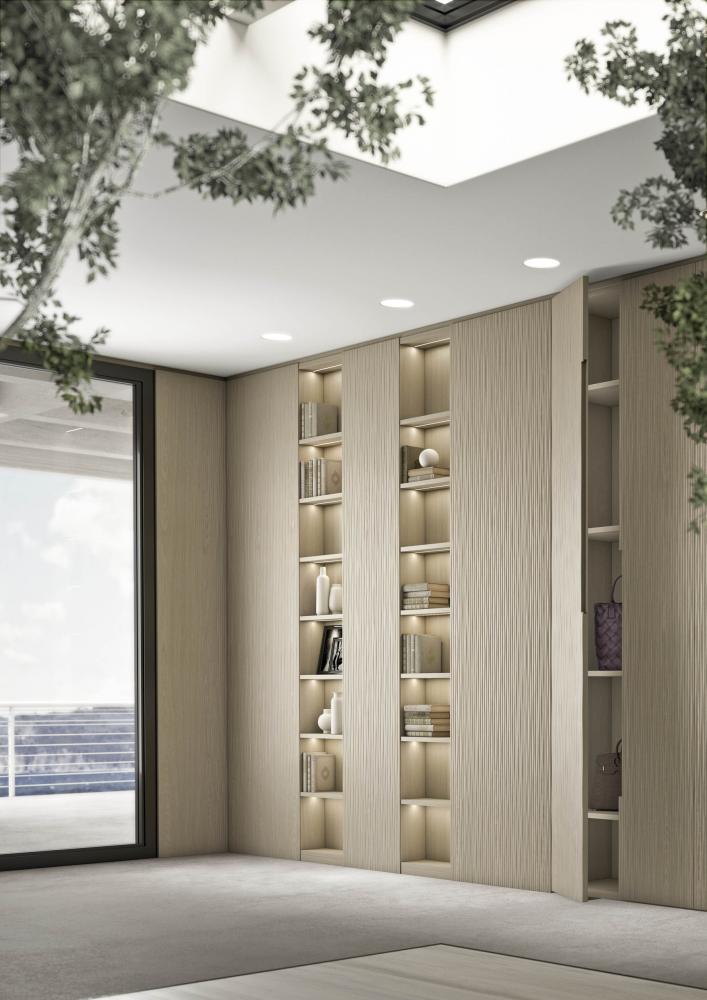 An accommodating solution with a unique design, which can be composed in multiple declinations of wardrobes, and combined with integrated wall panels and doors, open compartments or LED lighting.
