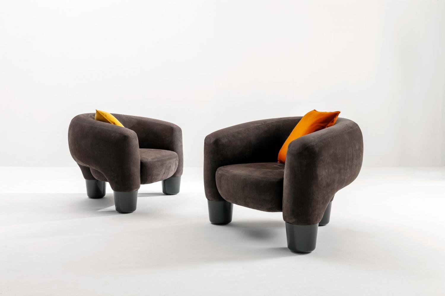 The Rialto armchairs stand out for their soft curves and imposing dimensions. A further highly characterizing design element is the presence of three sturdy marble legs, which give originality and rigor.