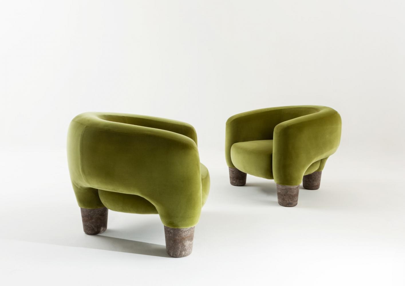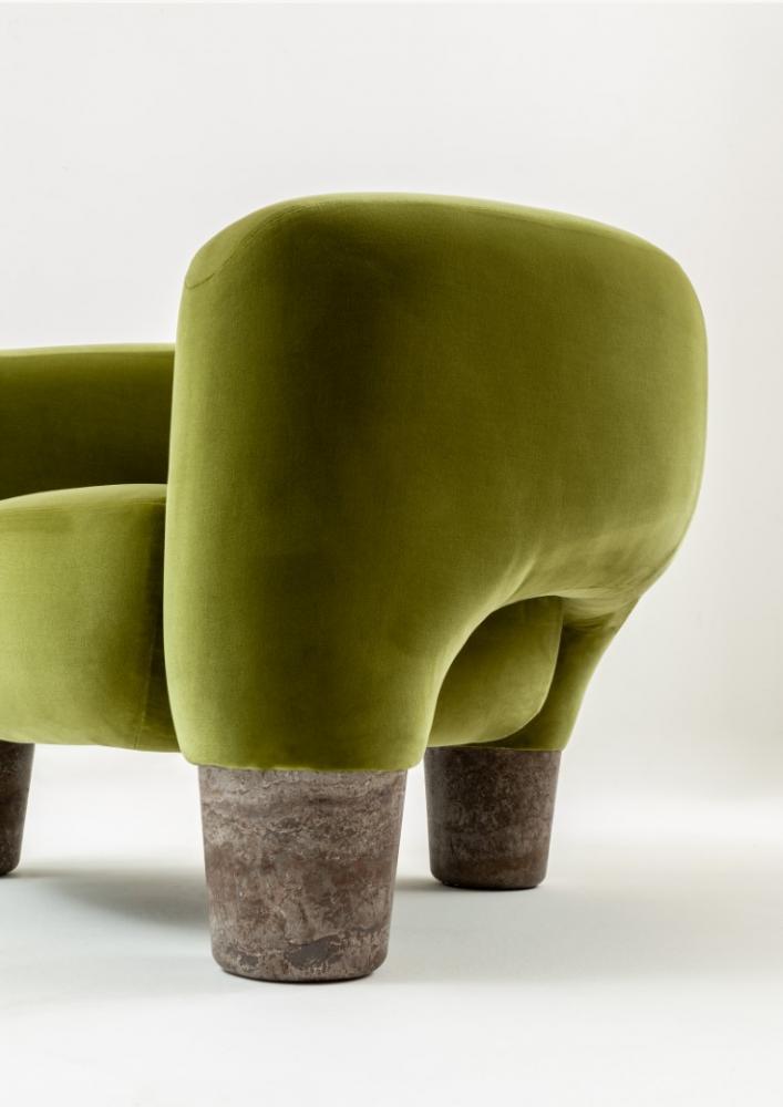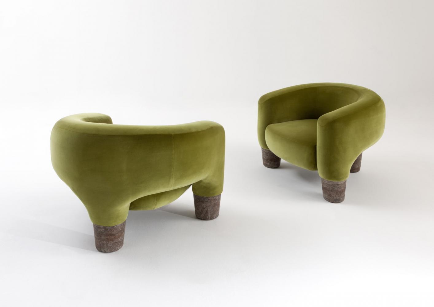Padded armchairs covered in leather, velvet or fabric, and characterized by three sturdy marble legs.