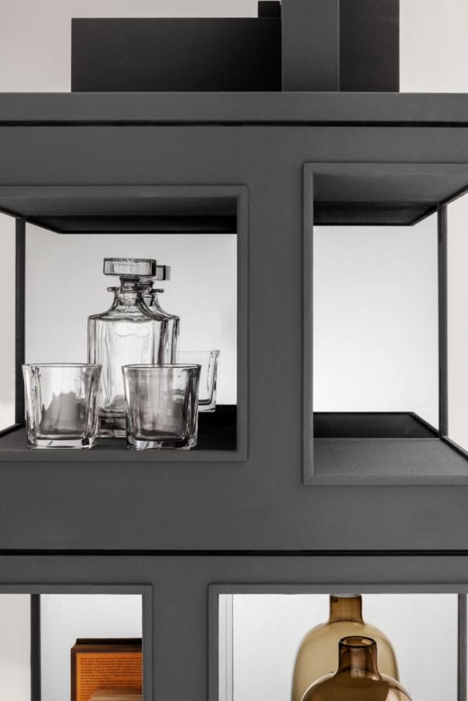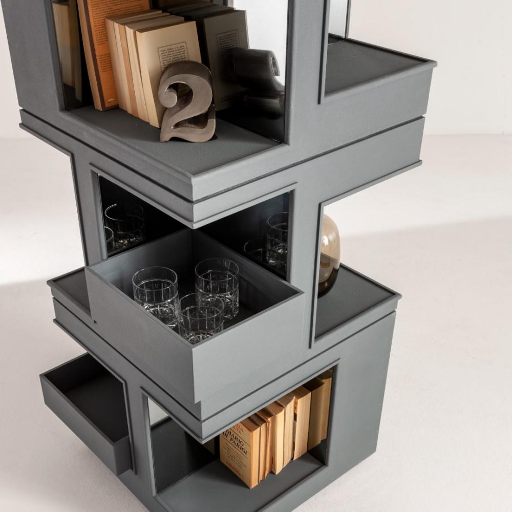 Column made of wood or with a concrete-effect finish, which accommodates a series of removable trays in polished steel, or in concrete-effect, in several compartments made in different sizes.