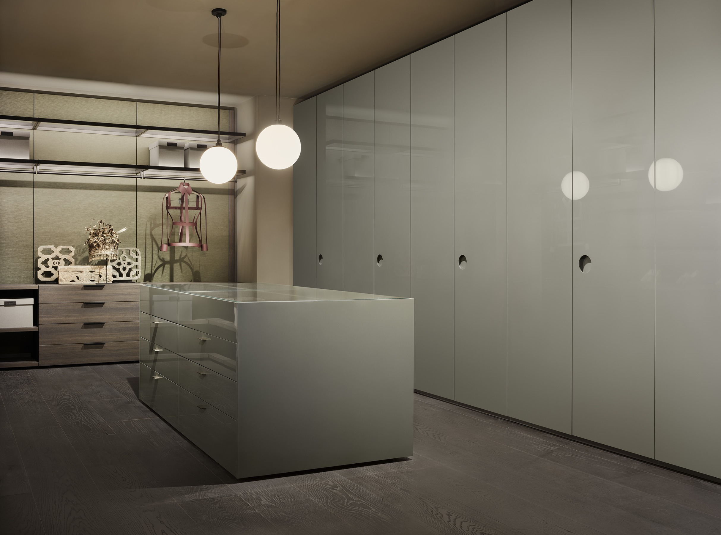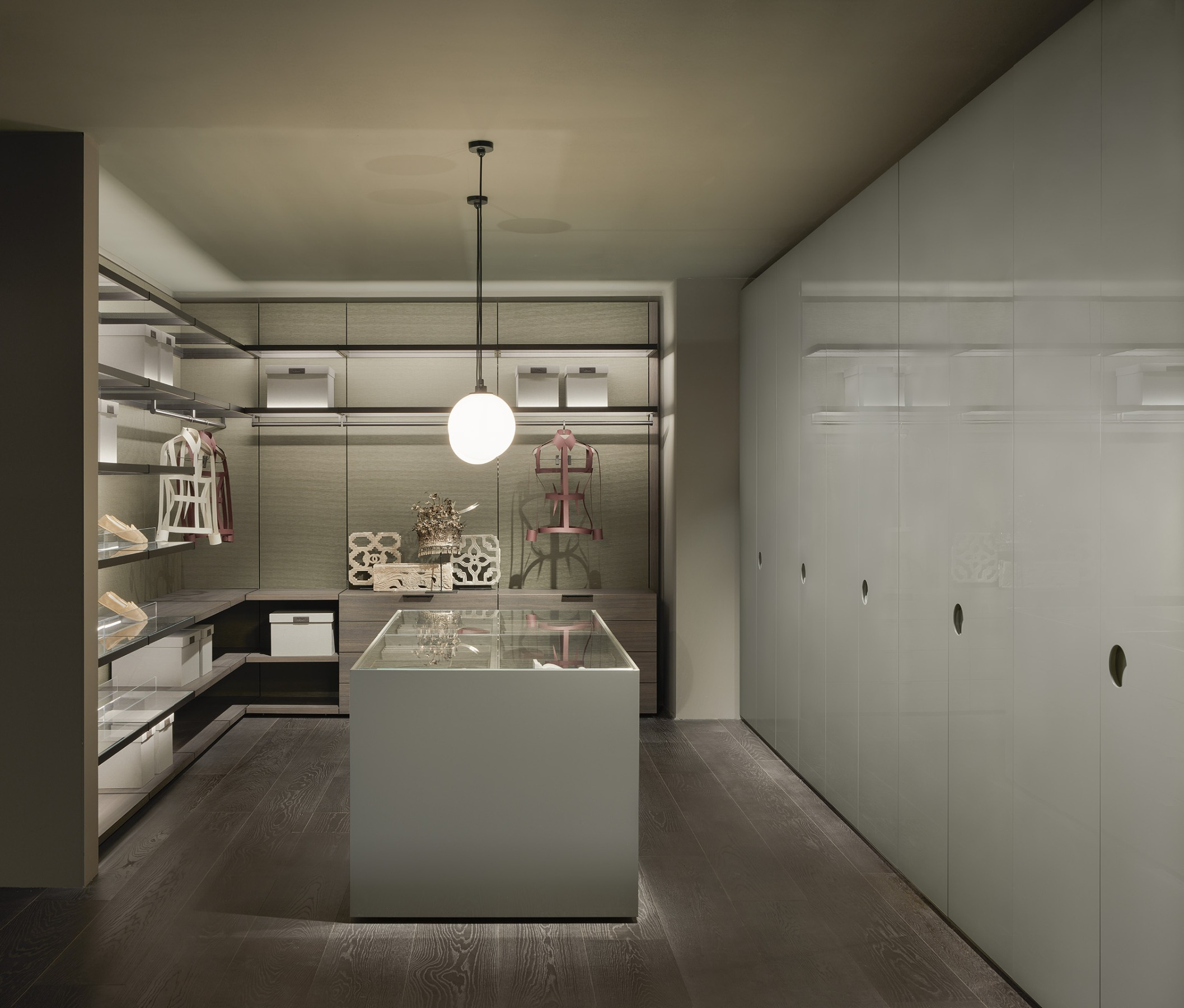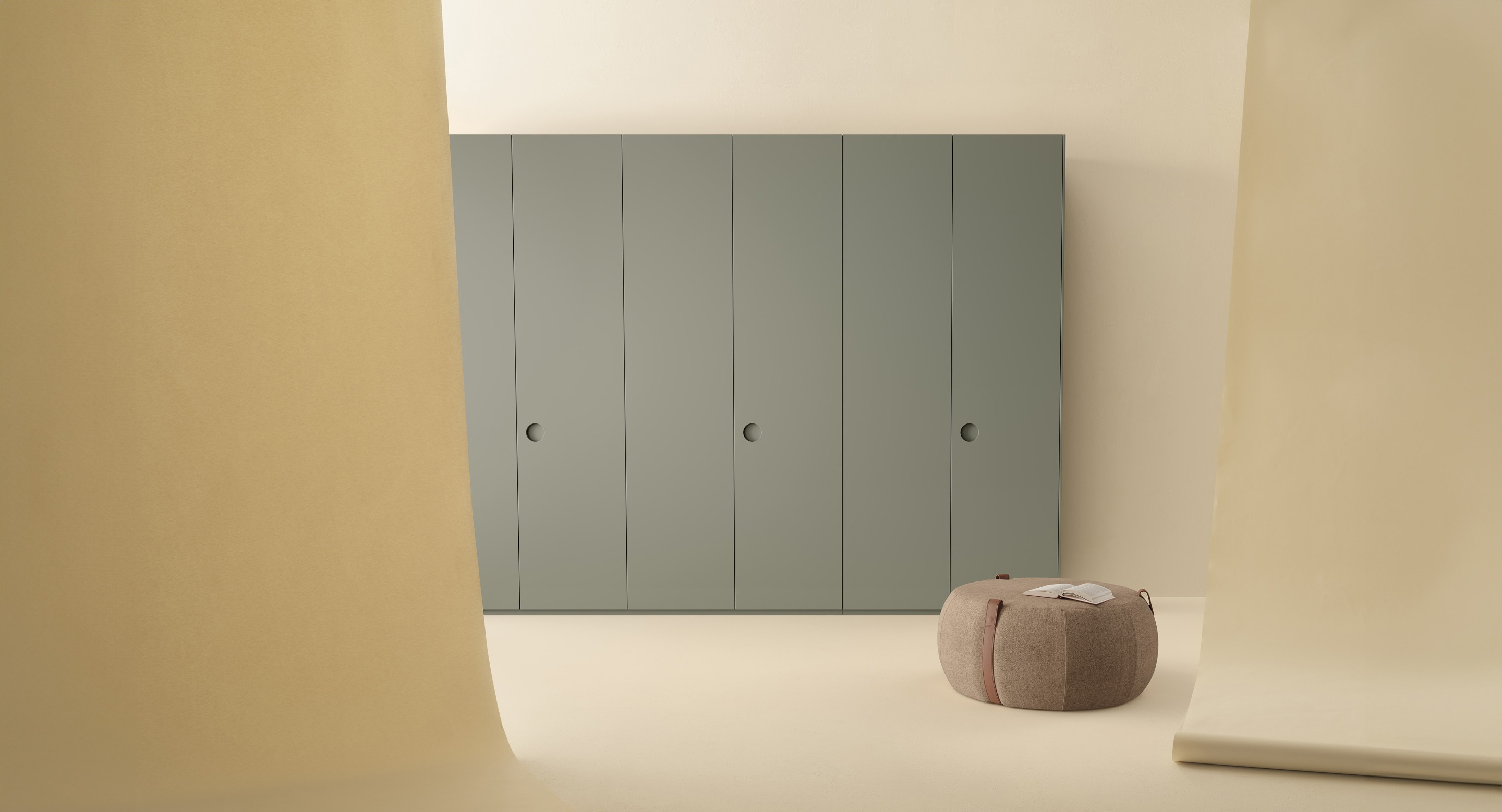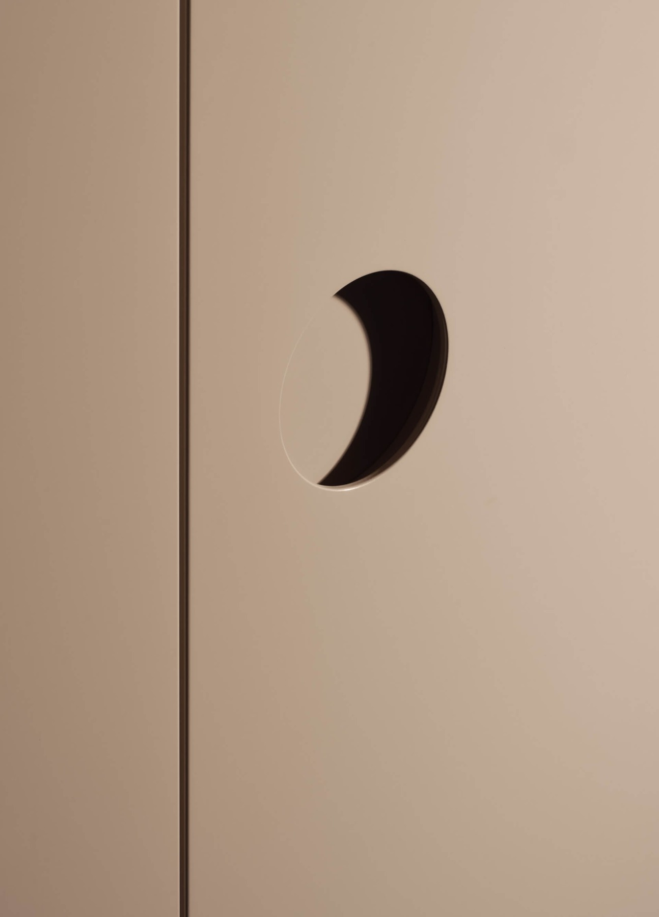 Elegance and functionality brush against each other like light and shadow in Eclisse, the Centimetre Wardrobe designed by Piero Lissoni. The hinged door is characterised by a circular handle carved into its thickness, a stylistic device capable of welcoming light by creating a play of shadows within it that recalls the phases of an eclipse, the inspiration for the entire project. Presented with a matt or glossy finish, Eclisse can be customised in every detail: the wide range of finishes in the catalogue makes it possible to create a wardrobe tailored to one's own style, personalising dimensions and colours. The bottom of the handle, matt lacquered, can be tone-on-tone or in contrast with the door to create unusual and personal colour combinations. The interiors can be accessorized with drawer units, shelves and clothes rails with integrated light, without forgetting precious leather and fabric details such as the mats for the drawers and boxes for the shirt compartments.