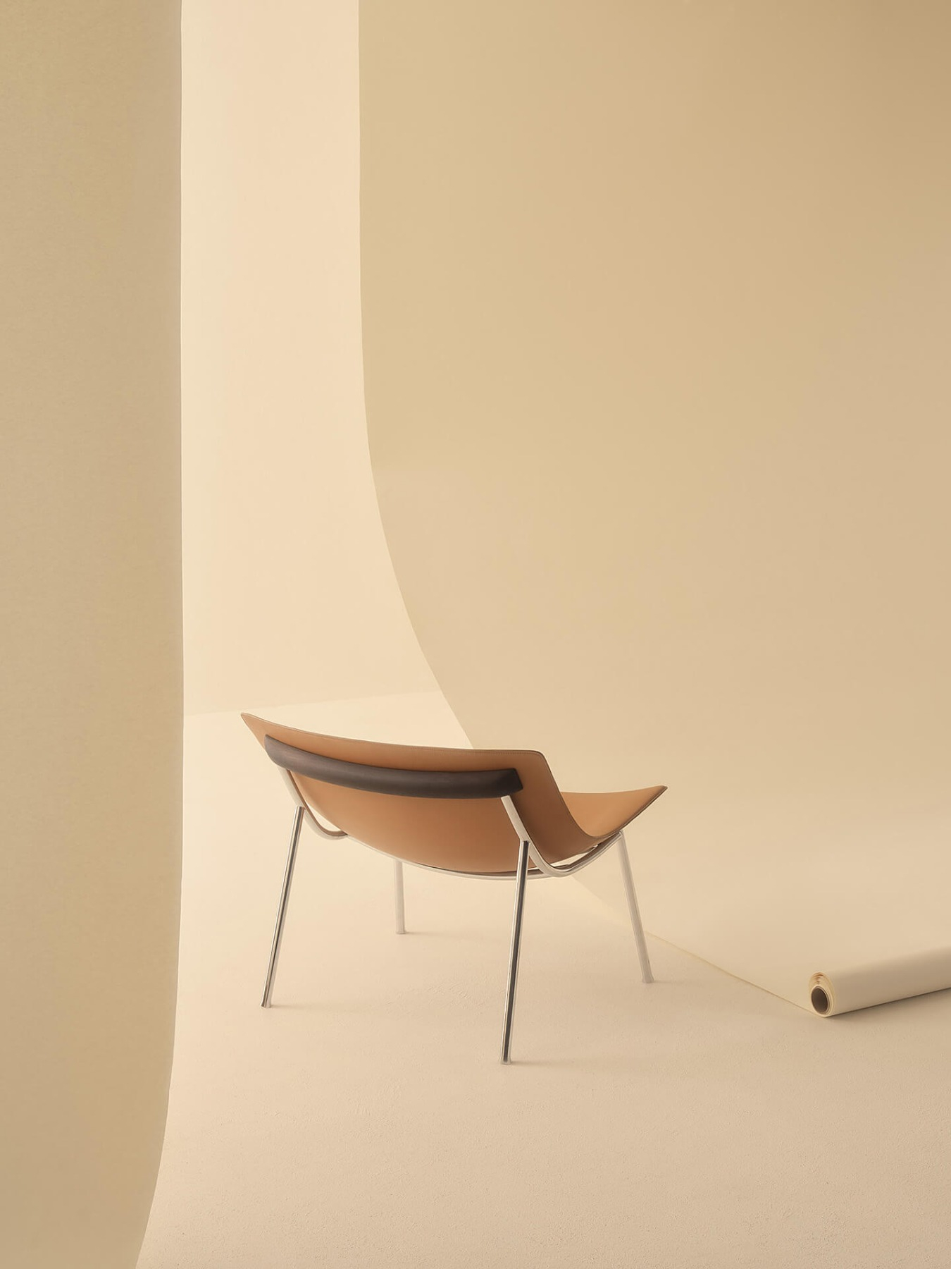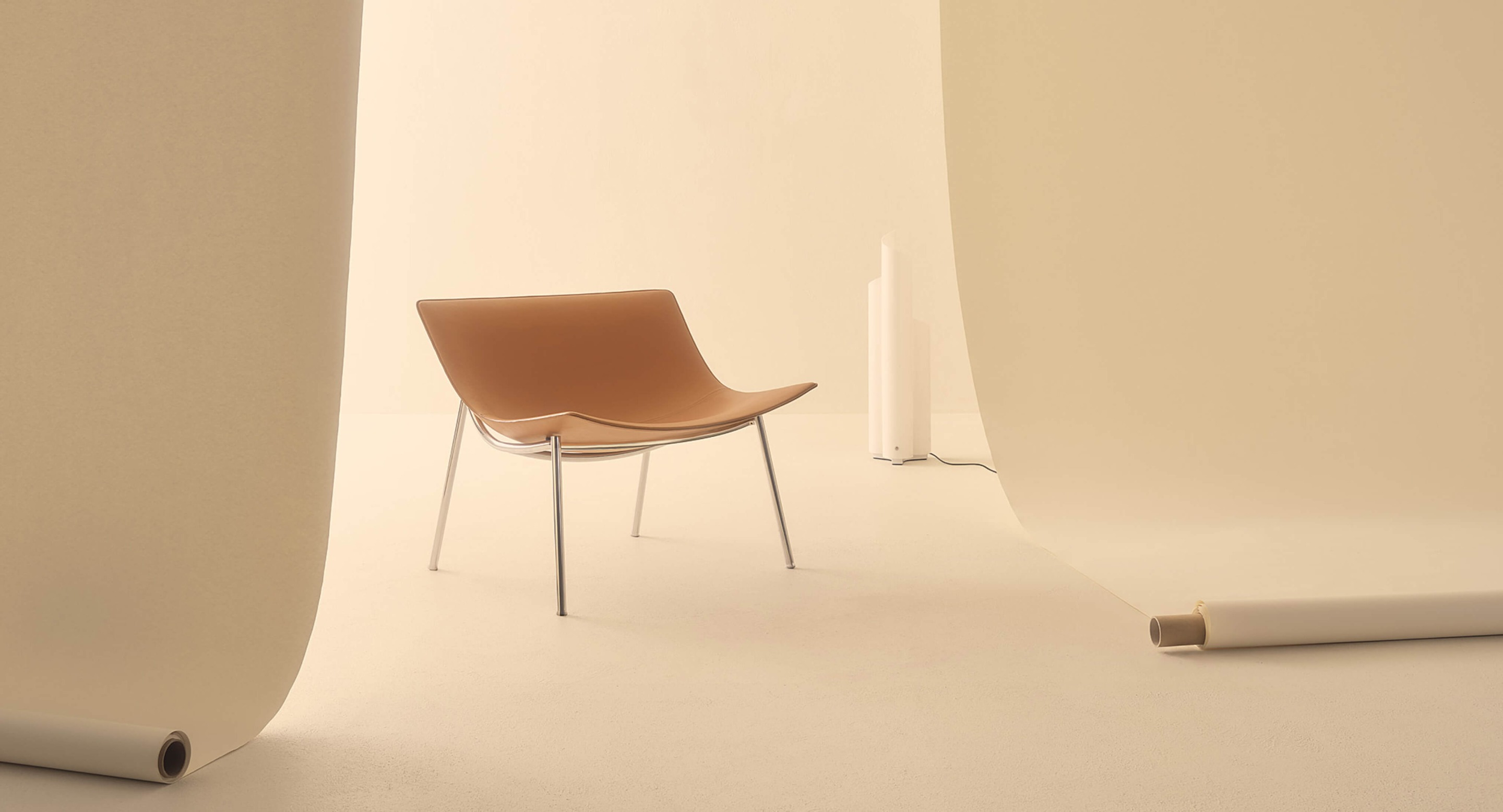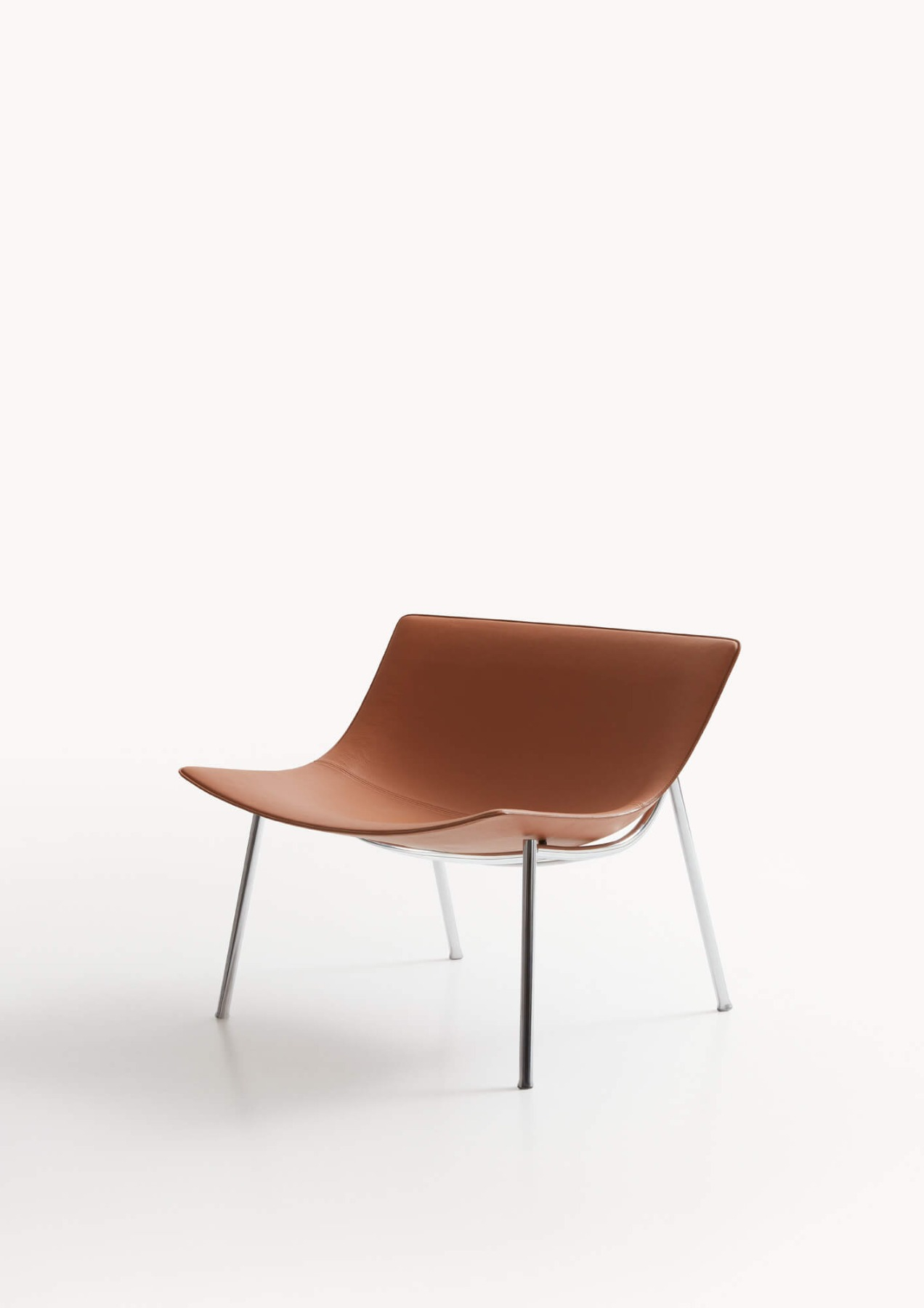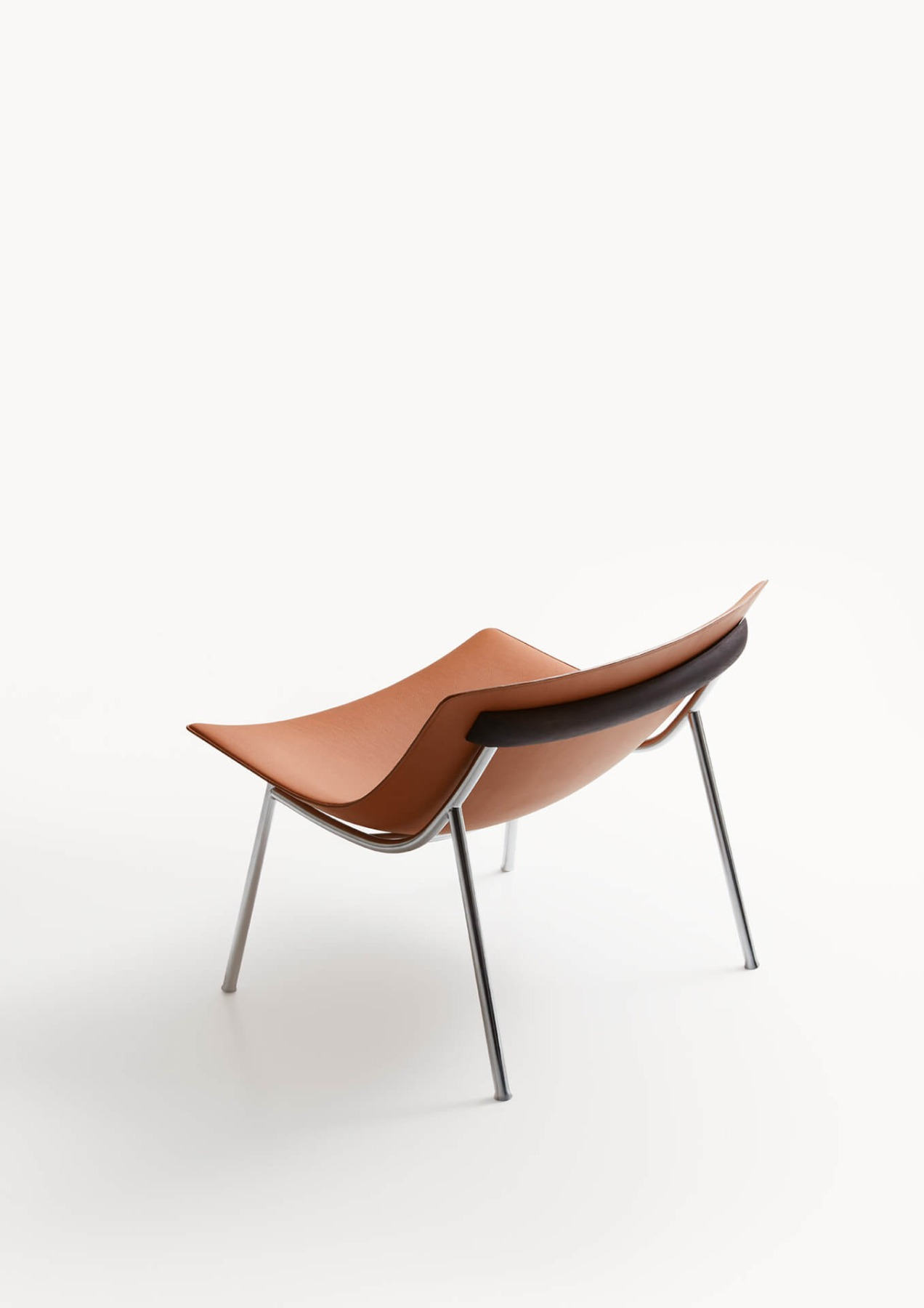 Omega is a lounge armchair created from a blend of history, materials and iconicity. Its elegant and contemporary design is inspired by the stylistic features of the 50s: from this combination a timeless proposal takes shape where vintage charm blends with a modern aesthetic. Characterised by a lightly padded printed shell covered in leather or vegan leather, Omega combines the softness of the seating shape with the solidity of the metal structure. A horizontal wooden element welcomes and supports the backrest of the monocoque chassis, whose shape is emphasised by a stitching that defines its edges.