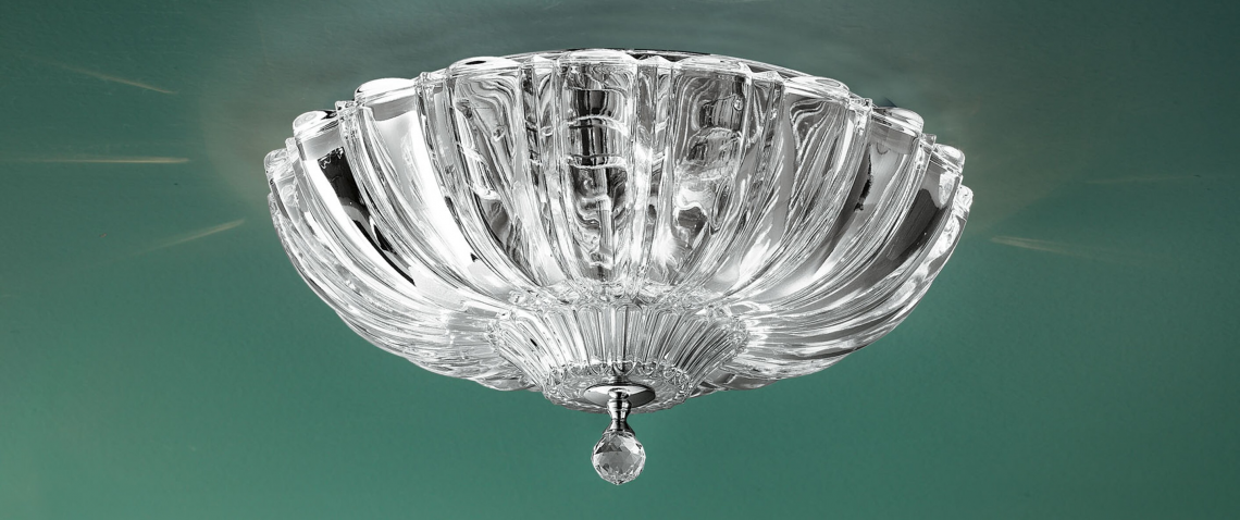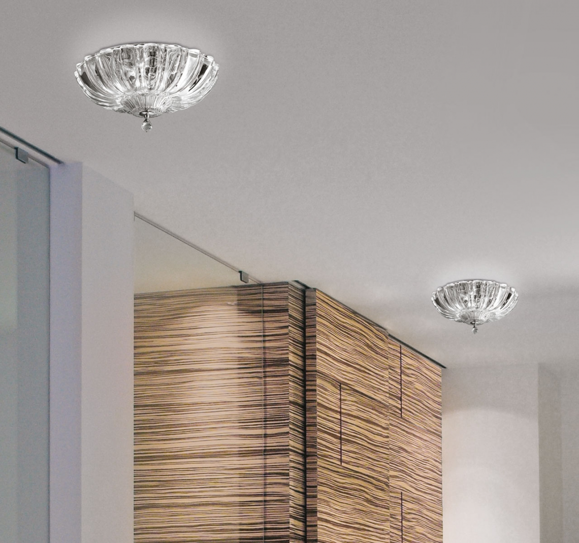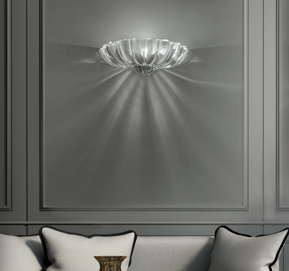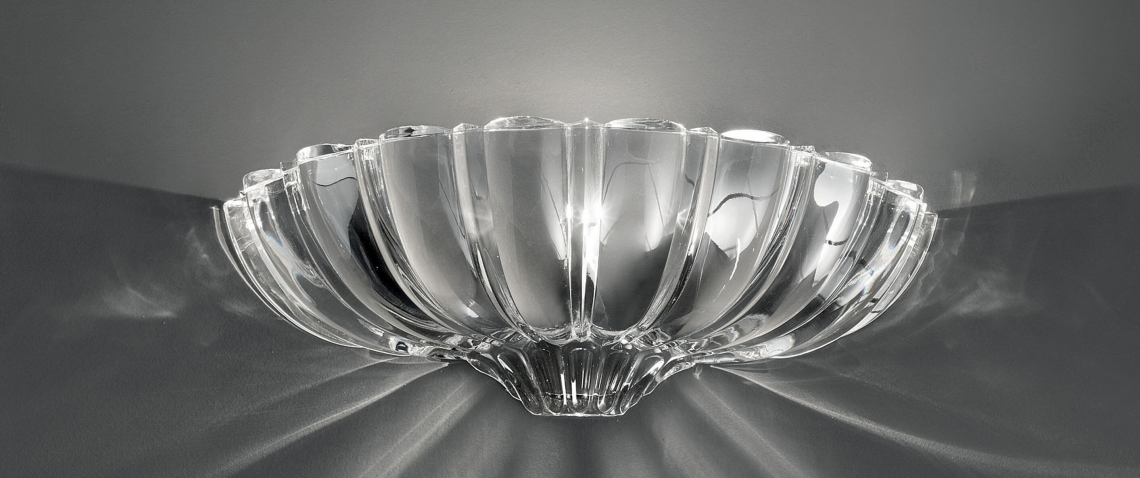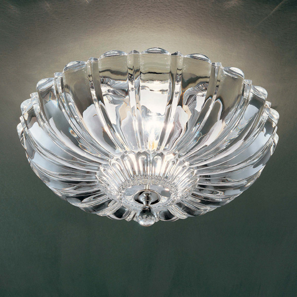Pascale is a wall and ceiling lamp in shimmering genuine crystal designed by Leucos Design Lab. Handmade in Italy using a pressed rib mold and fracco details, the lamp creates a sparking diffused light that fills the area with elegance and tradition. Its ribbed pattern extenuates this effect and adds visual appeal. The Pascale Ceiling comes in 2 sizes (30 and 40 cm – 11 3/4” and 15 3/4”) and the collection also includes a wall lamp (40 cm – 195 3/4”).